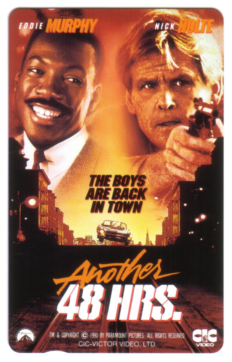 This collectible card features promotional artwork for the movie "Another 48 Hours," produced by Paramount Pictures. The front side displays Eddie Murphy and Nick Nolte, the stars of the film, depicted prominently. Both actors appear in character, with Eddie Murphy on the left wearing a leather jacket and Nick Nolte on the right dressed in a dark jacket and tie. The background features the movie’s title, "Another 48 Hours," in bold yellow and red lettering at the center of the image.