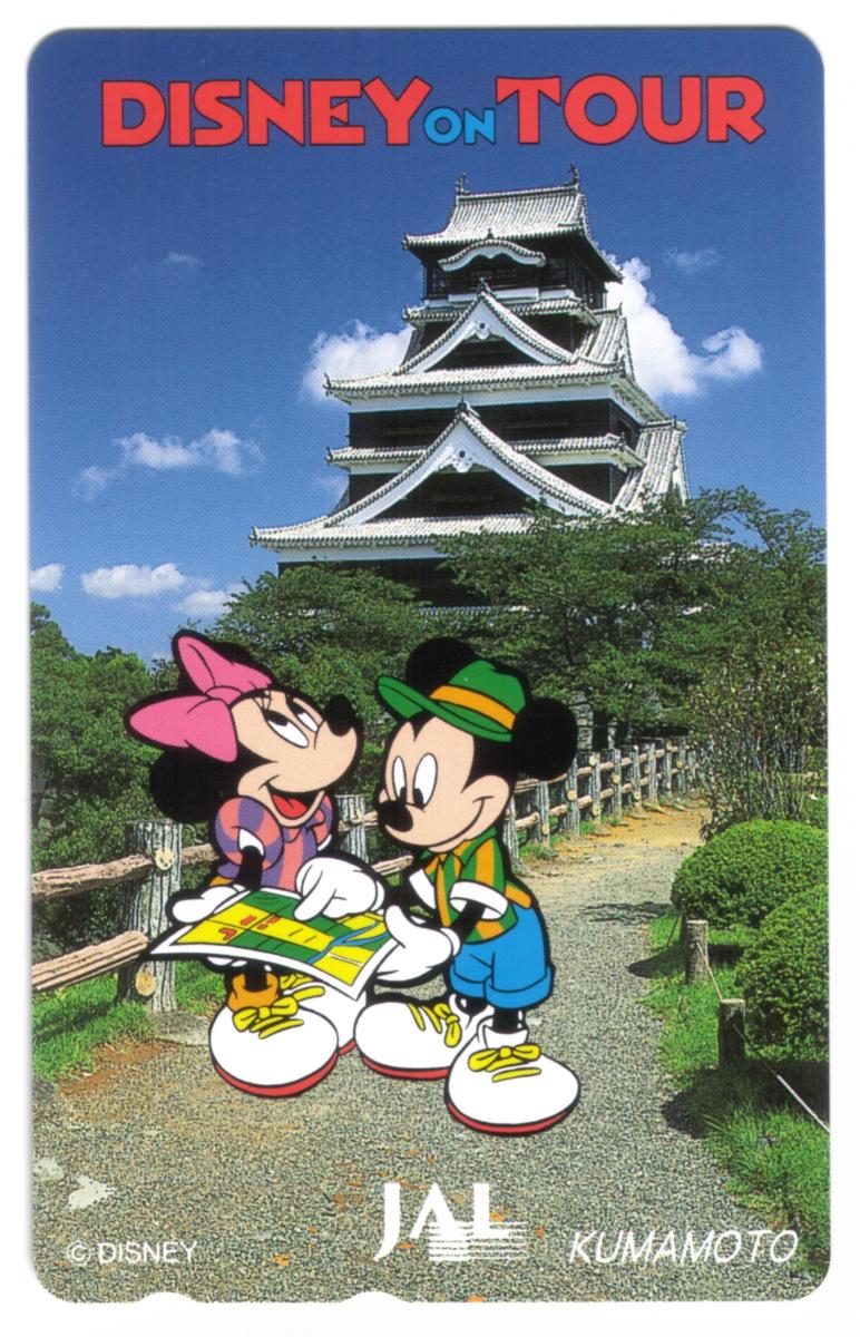 At the top of the card, the red and blue text reads "DISNEY ON TOUR." The bottom of the card includes the logos "© DISNEY," "JAL" for Japan Airlines, and the word "KUMAMOTO" identifying the location depicted. The card is from Japan and reflects collaboration between Disney and Japan Airlines, highlighting tourism in Kumamoto. The overall design combines cultural elements with classic Disney characters in a vibrant travel scene.