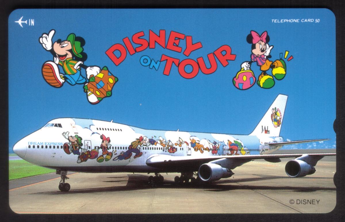 This collectible telephone card features a detailed image of a Japanese Airlines airplane decorated with Disney characters as part of the "Disney On Tour" promotion. The airplane prominently displays painted images of Minnie and Mickey Mouse carrying colorful luggage. The Disney characters are arranged along the side of the aircraft, adding vibrant and playful artwork to the plane’s exterior. The background shows the airplane on the tarmac under a clear blue sky.