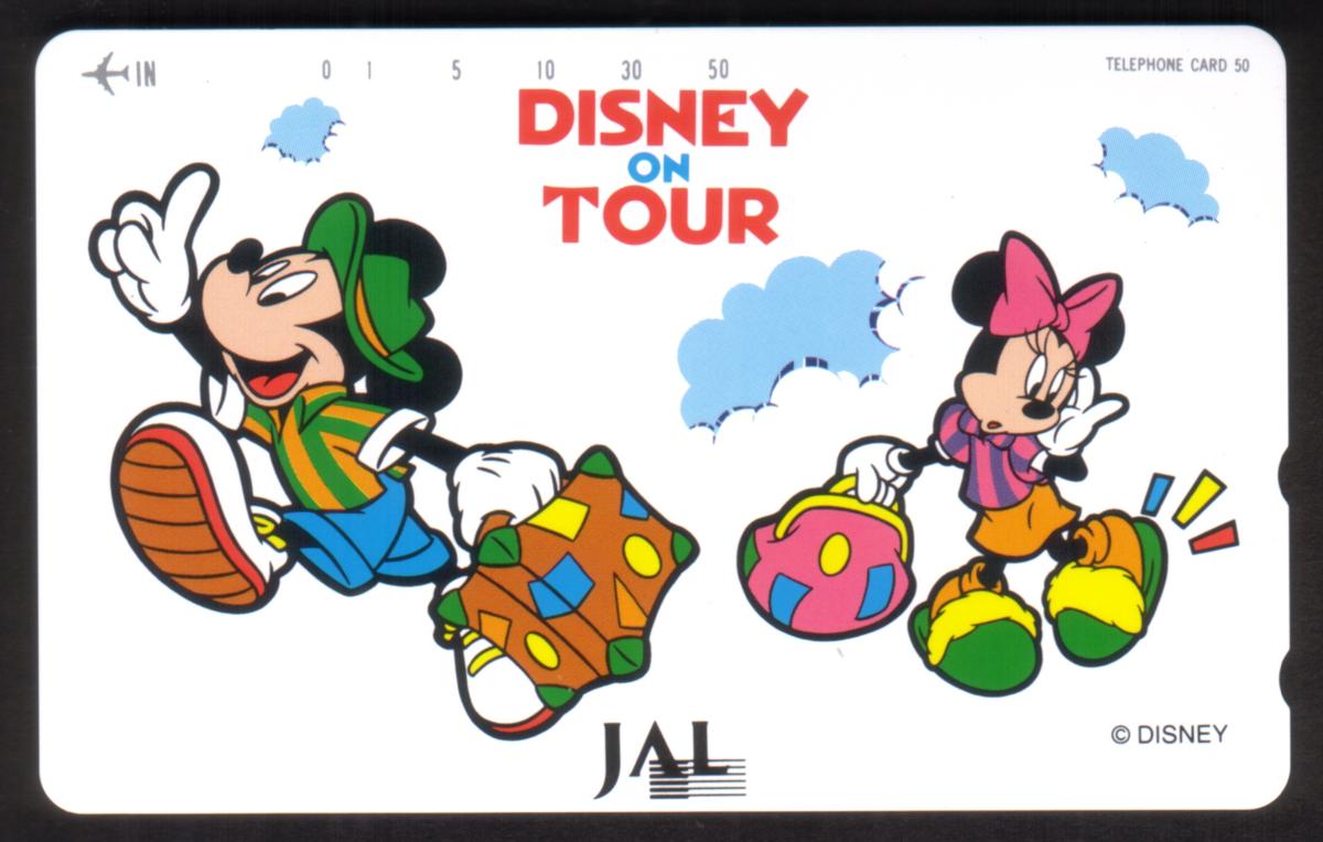 The top center of the card displays the text "DISNEY ON TOUR" in red and blue letters. The lower center shows the "JAL" logo, representing Japan Airlines. The bottom right corner contains the © DISNEY copyright mark. Above the printed artwork are small markings indicating increments for card usage from 0 to 50.