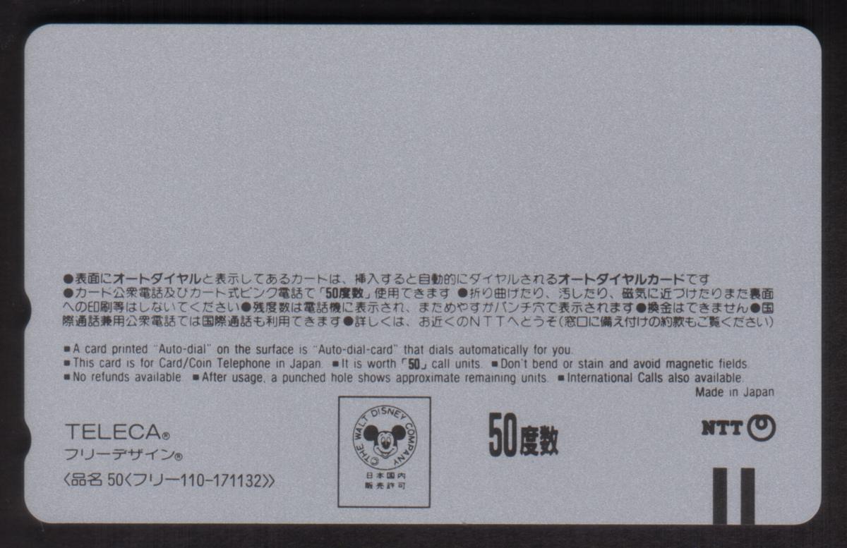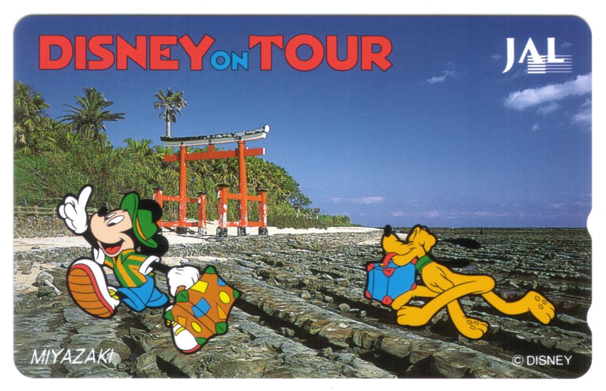 This phone card commemorates a collaboration between Disney and Japan Airlines, showcasing iconic Disney characters exploring the Miyazaki region. The vibrant colors and detailed background capture a cheerful travel theme, blending beloved animated characters with a real-world Japanese landmark.