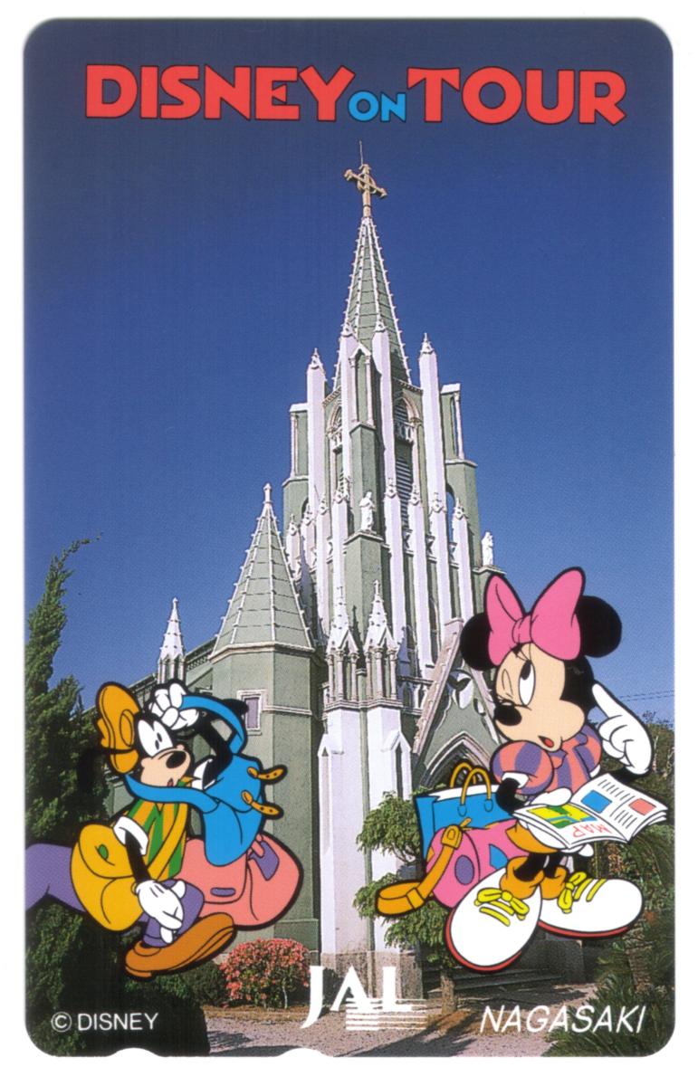 This collectible phone card features an image of a tall, ornate white church with a pointed, multi-tiered steeple set against a clear blue sky. The church is identified as being located in Nagasaki, Japan, as indicated by the text at the bottom right of the card. The card is part of the "DISNEY ON TOUR" series, with the logo prominently displayed in bright red letters at the top.