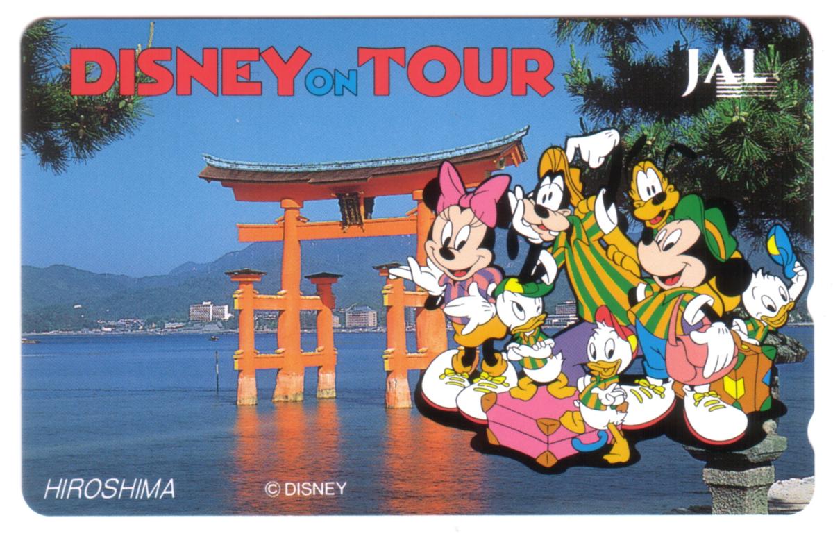 The text "DISNEY ON TOUR" appears in bold red letters across the top left of the card, while “HIROSHIMA” is printed in white at the bottom left corner, clearly identifying the unique cultural and geographic location. The card is marked with a © Disney copyright symbol near the bottom center, confirming its official licensing. This mint condition collectible phone card displays no holes and retains a pristine appearance, suitable for collectors focused on Japanese or Disney-themed phone cards, particularly those related to JAL and its special edition series.