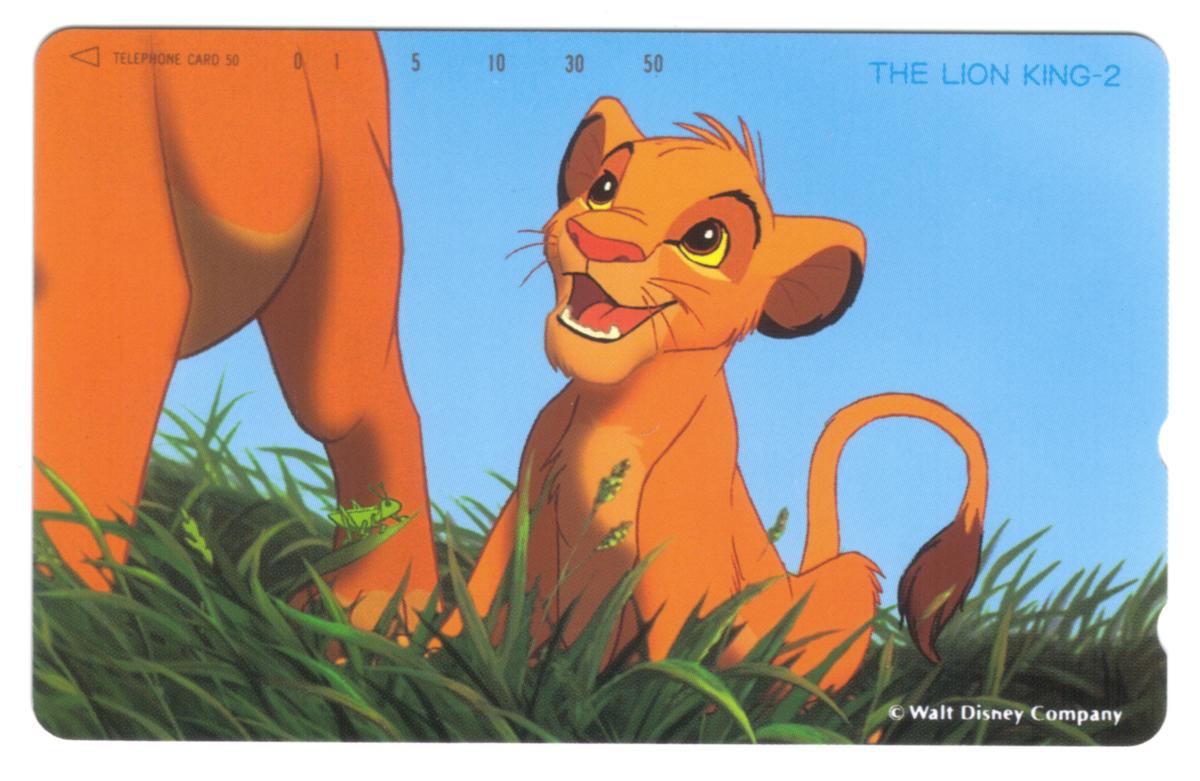 This collectible phone card features a vibrant image from Disney's The Lion King 2. It prominently displays a young lion cub, Simba, sitting amidst green grass under a clear blue sky. Simba looks upward with a joyful expression, showcasing his bright orange fur, large expressive eyes, and a tufted tail curved behind him. The left side of the card reveals a portion of an adult lion’s legs, suggesting a protective presence nearby.