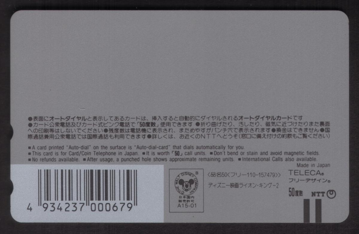 In the bottom right corner, there is a copyright notice credited to the Walt Disney Company. This card originates from Japan and is in mint condition with no hole punches. It is an officially licensed Disney collectible phone card linked to the 1998 sequel movie The Lion King II: Simba’s Pride.