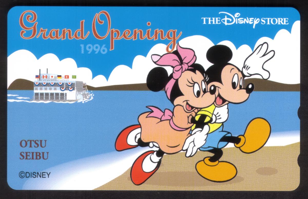 This collectible phone card commemorates the Grand Opening of The Disney Store in 1996 at Otsu Seibu, Japan. The card prominently features classic Disney characters Minnie Mouse and Mickey Mouse. Minnie is wearing a pink dress and matching bow, while Mickey is dressed in his traditional red shorts, yellow shoes, and white gloves. The two characters are holding hands and appear to be joyfully running or skipping together along a beach or waterfront setting.