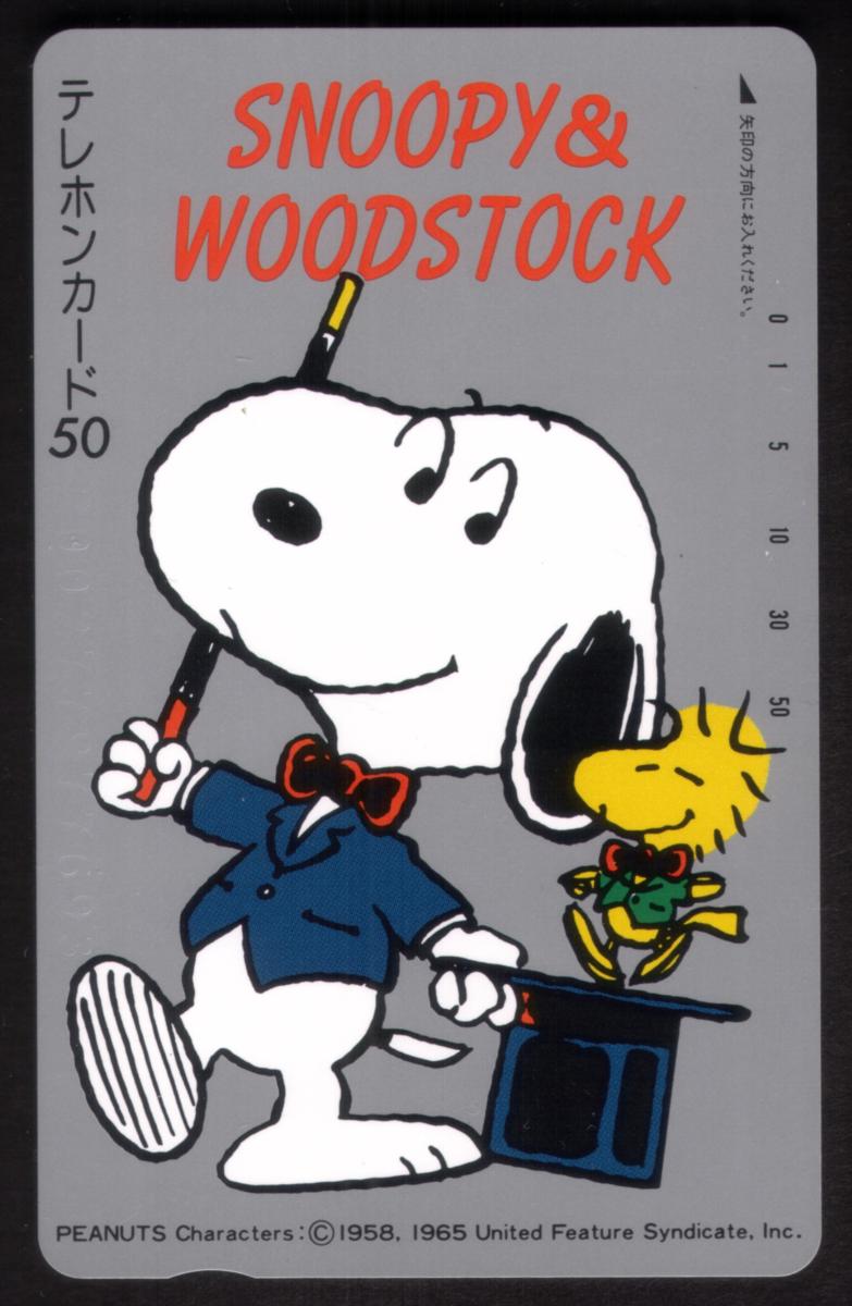This collectible phone card from Japan features the iconic Peanuts characters Snoopy and Woodstock in the center. Snoopy, dressed in a blue jacket with a red bow tie, is depicted holding a black magician's wand behind his back with one hand, while his other hand holds the brim of a black top hat. Woodstock, also wearing a red bow tie, is standing inside the top hat, holding a smaller green item. The background of the card is gray, and the text "SNOOPY & WOODSTOCK" appears prominently above the characters in bold red capital letters.