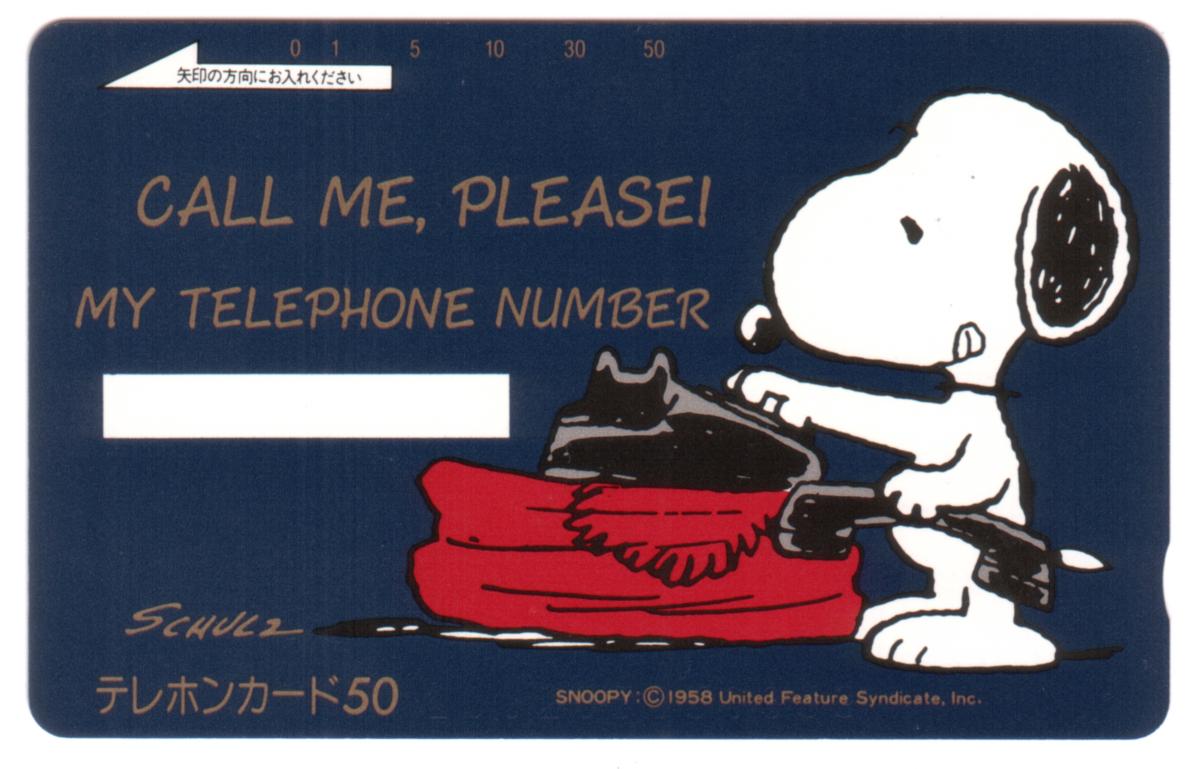 Text on the card includes a playful message in uppercase letters that reads, "CALL ME, PLEASE! MY TELEPHONE NUMBER," with a blank white box below the text intended for writing a telephone number. The card includes Japanese characters at the bottom left, indicating its face value of 50 units. Additionally, there is a copyright notice at the bottom right stating “SNOOPY © 1958 United Feature Syndicate, Inc.” The Schulz signature also appears near the bottom left side of the card, authenticating the artwork.