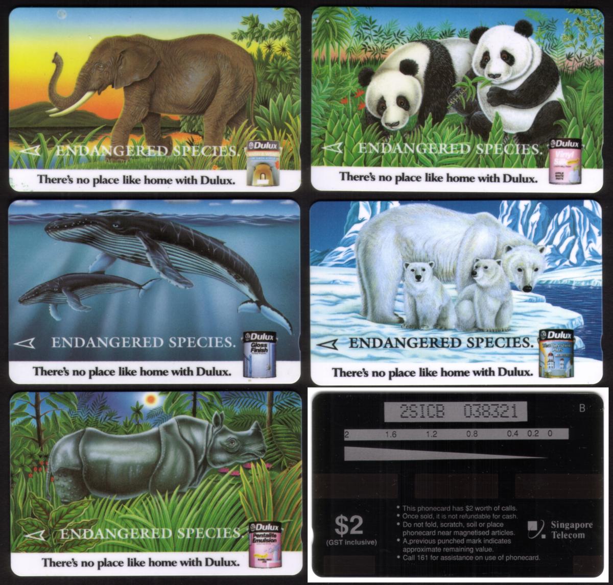 This collectible card from Singapore features a series of five endangered species prominently displayed as part of the Dulux Promo. The animals shown are a polar bear, panda, elephant, hippopotamus, and a whale. Each animal is rendered in vibrant detail, accurately representing the distinct characteristics of these species. The card includes clear references to these animals, highlighting the theme of endangered wildlife conservation.