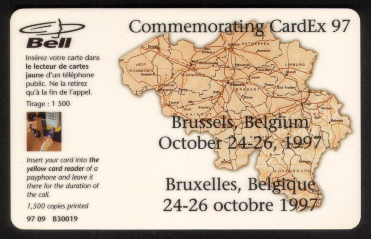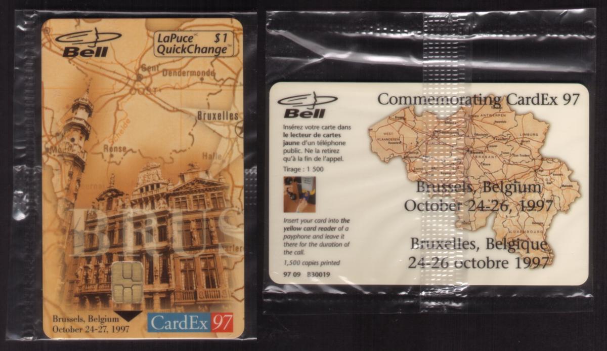The card is branded with the Bell logo in the upper left corner and marked as a "LaPuce $1 QuickChange" card in the upper right. The bottom portion specifies the event "CardEx 97" in a colorful rectangular logo, indicating the CardEx Expo held in Brussels, Belgium from October 24 to 27, 1997. Below the event logo, the text reads "Brussels, Belgium October 24-27, 1997," reinforcing the card's connection to this collectible show.