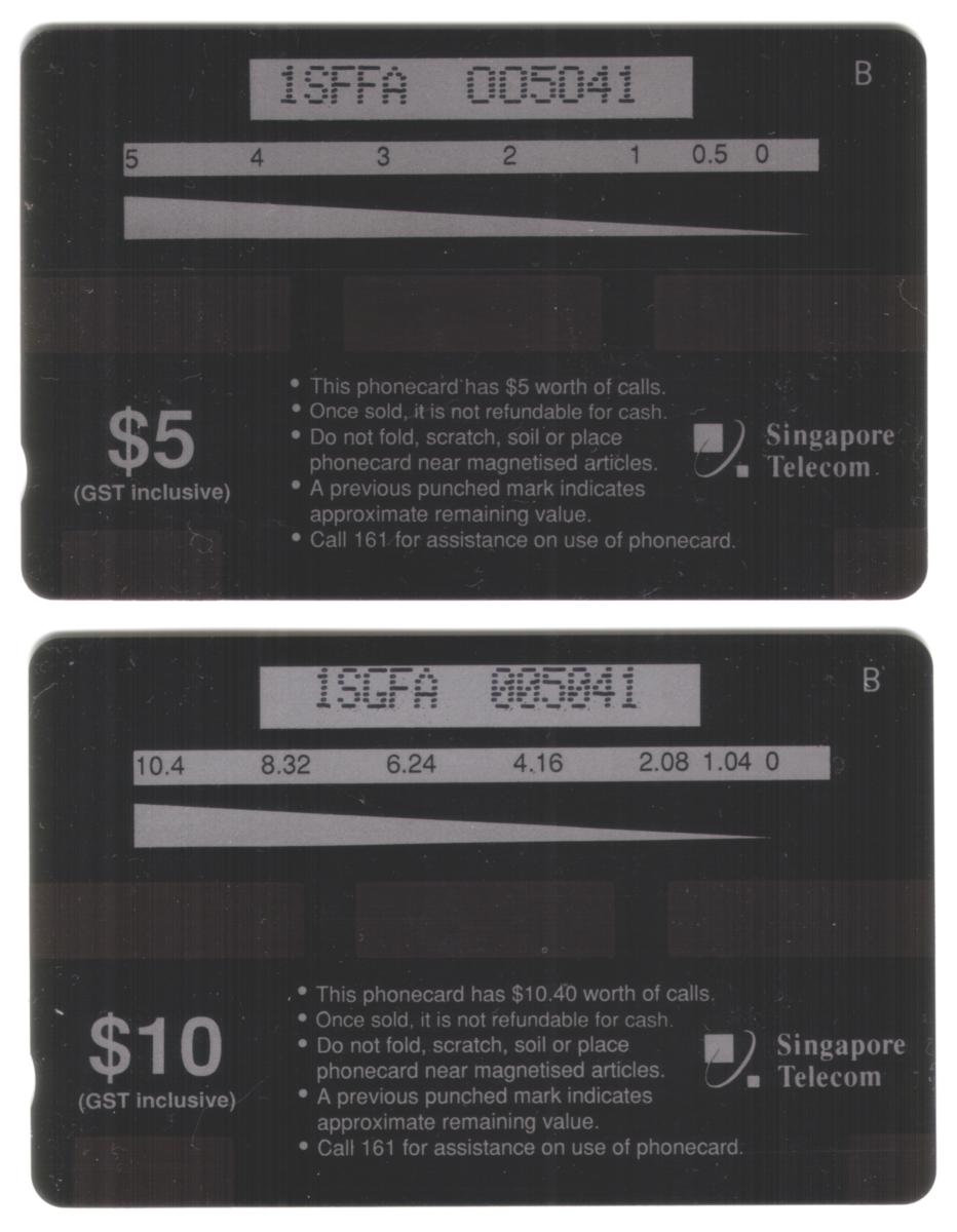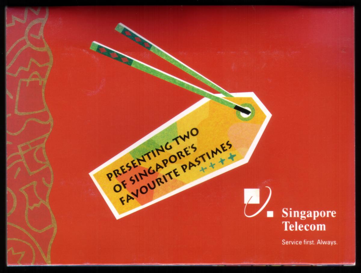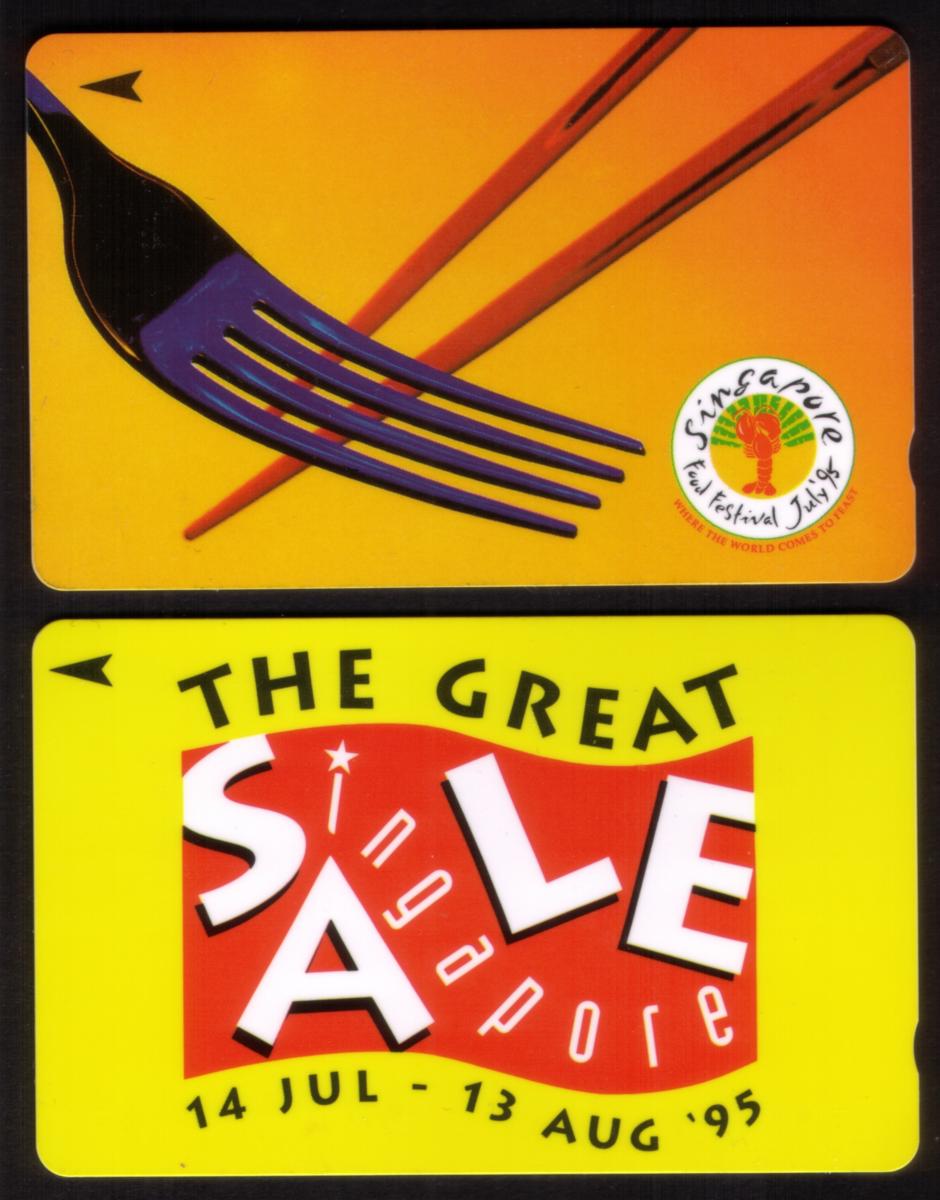 This collectible phone card set from Singapore features two distinct card designs, each representing popular themes and events from 1995. The first card showcases a visual of dining utensils with a bright orange background. Prominently displayed are a black fork and a pair of brown chopsticks crossed elegantly, symbolizing Singapore’s rich food culture. In the bottom right corner, there is a circular logo with the text "Singapore Food Festival July 95" surrounding a stylized chili pepper, emphasizing the celebration of Singapore’s culinary heritage.