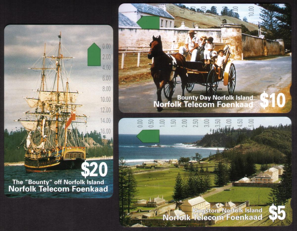 This set of three collectible phone cards from Norfolk Telecom Foenkaad features distinct images representing Norfolk Island's heritage and scenery. The $20 card displays a detailed photographic image of the ship "The Bounty" off Norfolk Island, showing the full rigging and sails of the historic vessel against a backdrop of coastline and trees. The card includes a vertical value scale from $2.00 up to $16.00 and clearly states "$20" in white text near the bottom right corner.