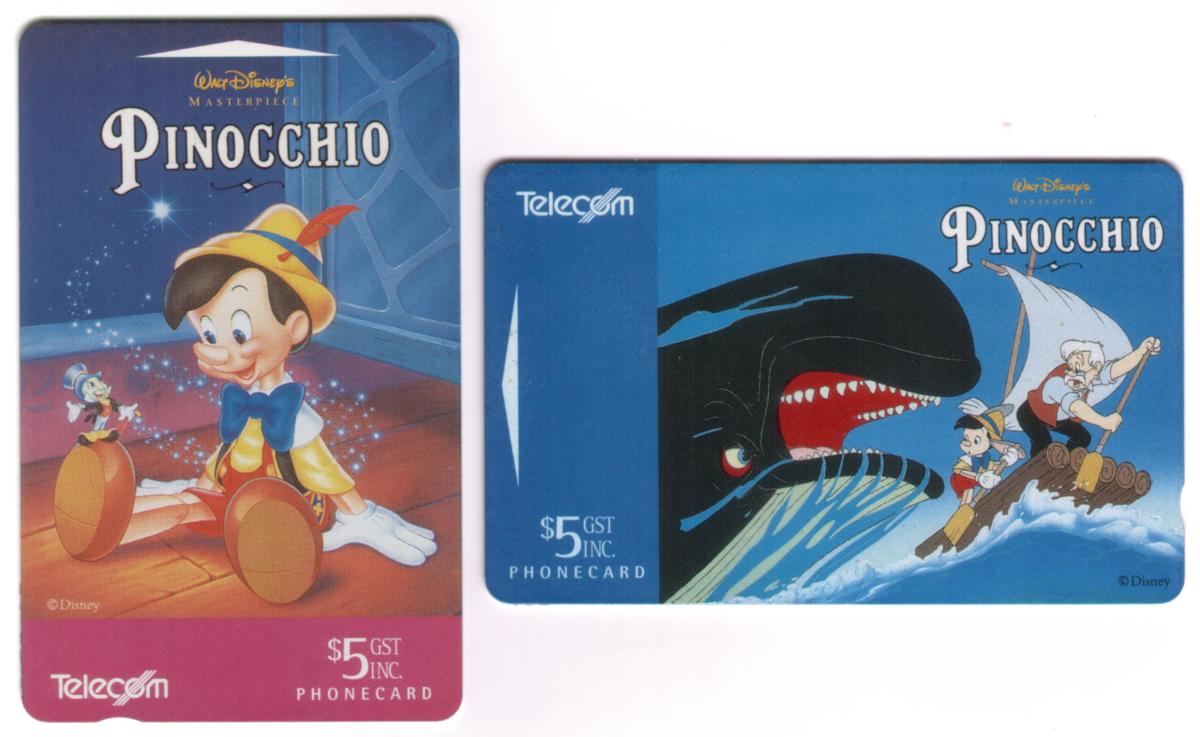 The second card depicts a dramatic scene from Pinocchio involving the whale Monstro. Monstro is shown with a large open mouth, sharp teeth, and an angry eye against a blue ocean background. Pinocchio and Geppetto are on a small wooden raft, with Geppetto holding a long oar to navigate. The water and waves around the raft suggest movement, enhancing the tension of the scene. The card is also a $5 GST Inc. phone card issued by Telecom New Zealand and includes Disney’s Pinocchio branding.