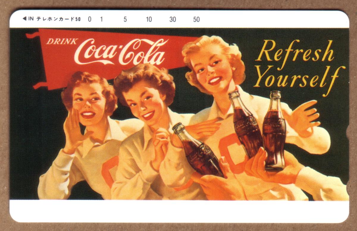 This collectible phone card from Japan features a vintage Coca-Cola advertisement prominently displayed on the front. The image shows three smiling women dressed in retro-style clothing, each holding a classic glass bottle of Coca-Cola. The background is dark with a vibrant red banner on the left side bearing the iconic white Coca-Cola logo and the words "DRINK Coca-Cola." On the right side, the phrase "Refresh Yourself" is written in yellow, complementing the upbeat and inviting feel of the card.