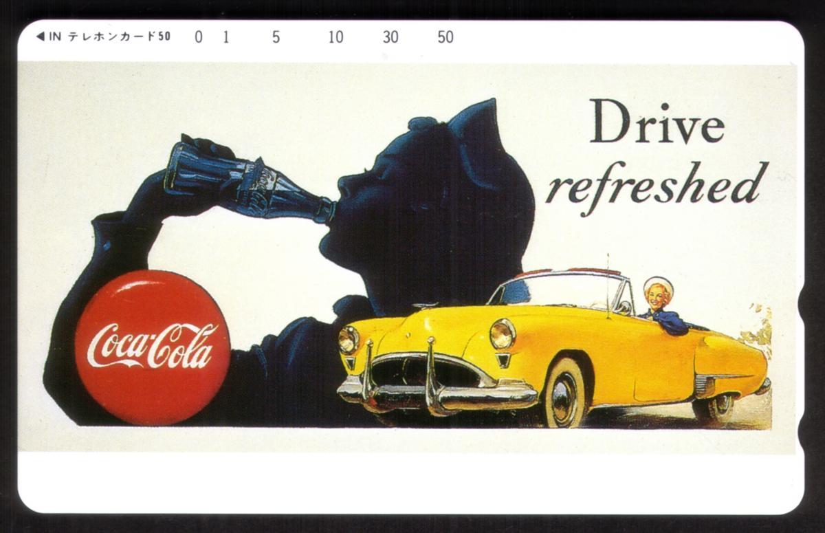 The top right section of the card presents the slogan "Drive refreshed" in elegant black font, connecting the invigorating qualities of Coca-Cola with the driving experience conveyed by the classic yellow car. The card's overall design balances bold colors—black, red, yellow, and blue—against a clean white background, which highlights the vintage advertisement’s joyful and refreshing theme.