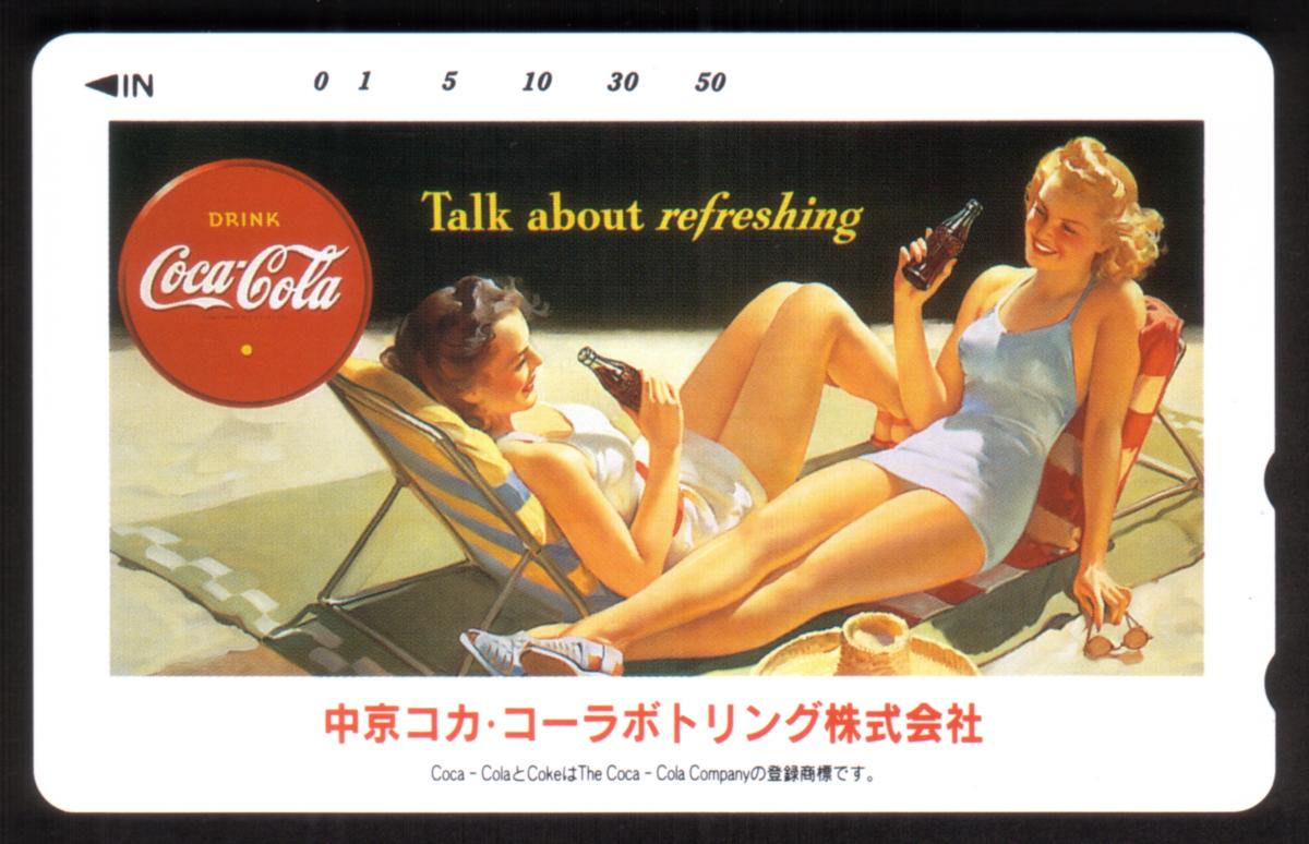 This collectible Coca-Cola phone card from Japan features a detailed vintage advertisement showing two women relaxing on beach lounge chairs while drinking Coca-Cola. Both women are dressed in 1940s-style swimwear; one wears a light blue one-piece swimsuit, while the other wears a white two-piece swimsuit with a translucent cover-up draped over her. They smile and enjoy their Coca-Cola bottle drinks, highlighting the refreshing appeal of the beverage. The scene is set on a sunlit patio with the shadows of a window frame visible on the ground.