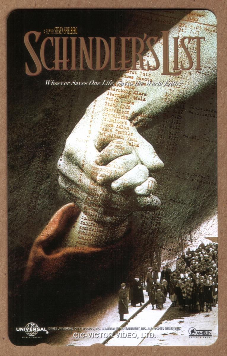 This card was produced in Japan and has strong ties to Universal Studios. The design and text elements reflect the promotional nature of the card as related to the "Schindler's List" video release. The card is marked "MINT" and explicitly mentions "No Holes," highlighting its condition for collectors.
