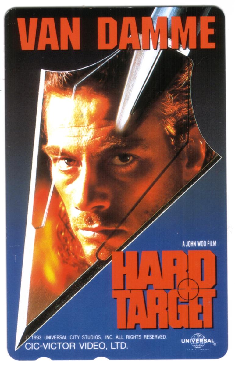 This hard plastic promo card is from Japan and relates directly to Universal City Studios' promotion of the movie "Hard Target." The card is in mint condition and does not contain any holes, making it a valuable collectible piece for fans of Van Damme, John Woo, and early 1990s action cinema.