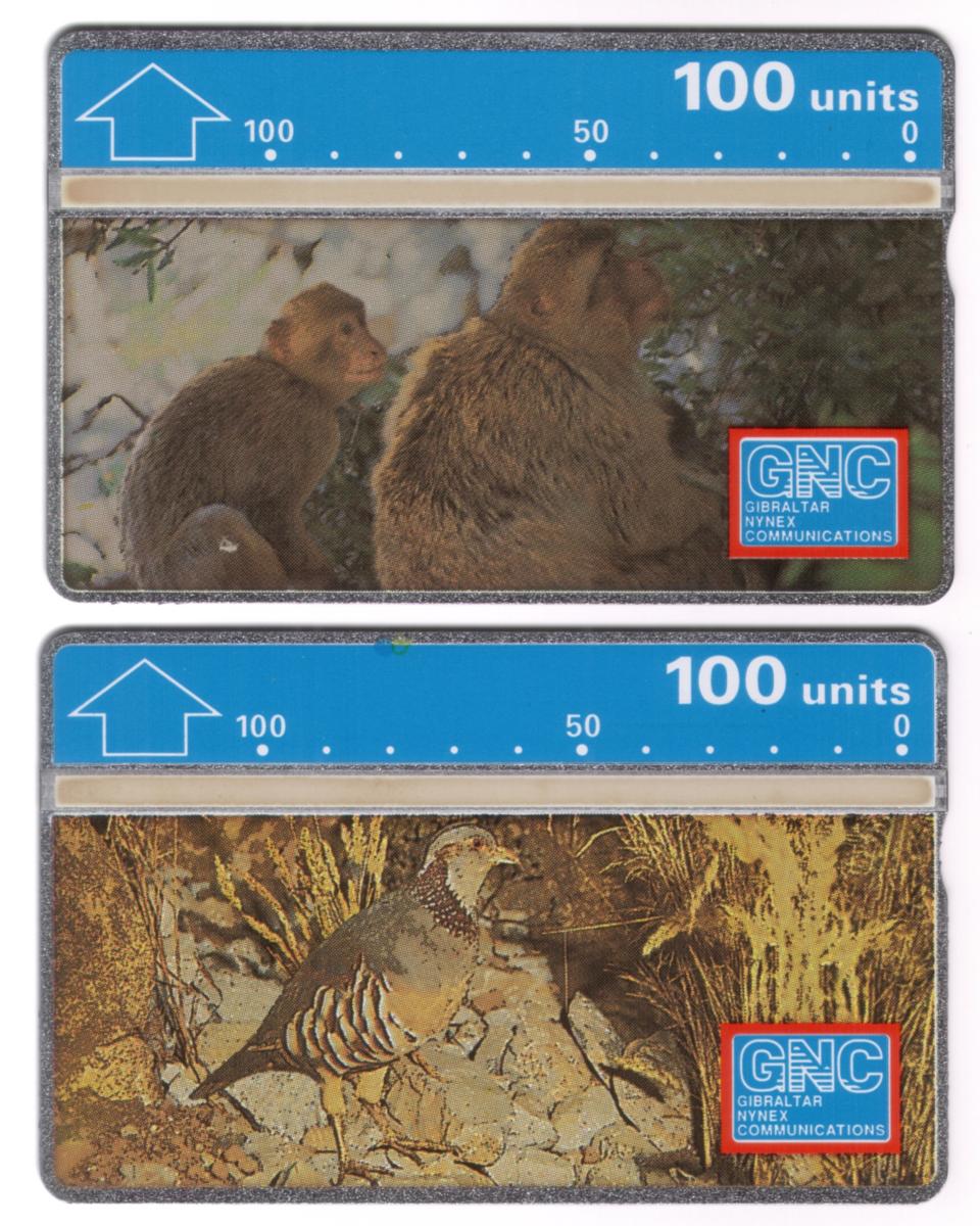 This set includes two collectible phone cards issued by Gibraltar NYNEX Communications (GNC). Each card features a detailed photographic image of two iconic animals native to Gibraltar: the Barbary Apes and the Barbary Partridge. The images prominently showcase these animals in natural settings, emphasizing their significance to the Gibraltar region.