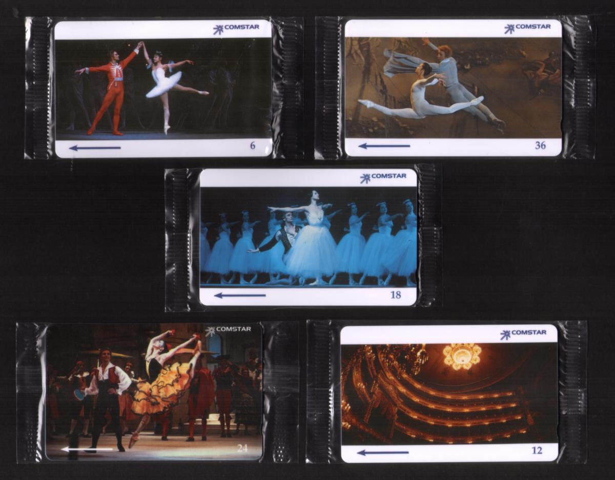 The artwork presents a refined and sophisticated style, capturing the spirit of theatrical dance. The Bolshoi interior is visible, emphasizing the cultural and historical significance of the prestigious Bolshoi Theatre in Russia. The card includes Russian text and mentions "Russia" and "Comstar," indicating the card’s origin and service provider.