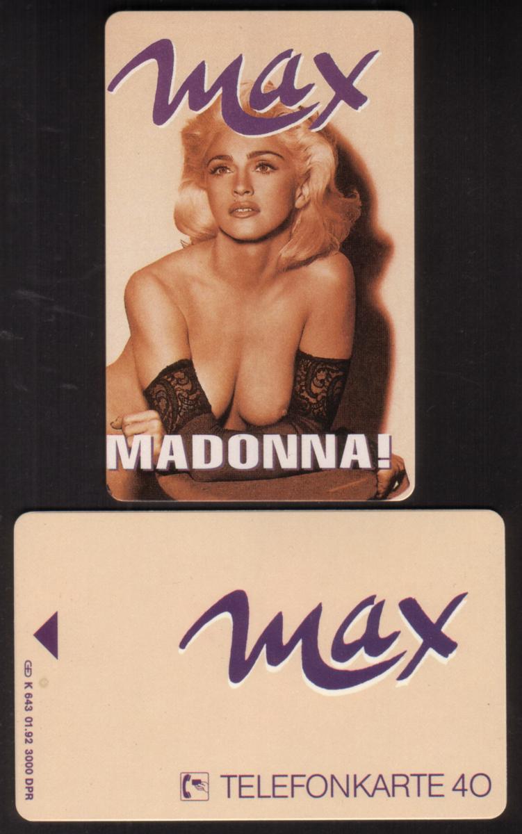 This collectible card from Germany features a rare photographic image of Madonna from a 1992 issue of MAX Magazine. The photograph depicts Madonna nude, capturing a striking and iconic pose. The image is glossy and vivid, showing details such as Madonna’s expression, hairstyle, and the artistic style of the original magazine photo.