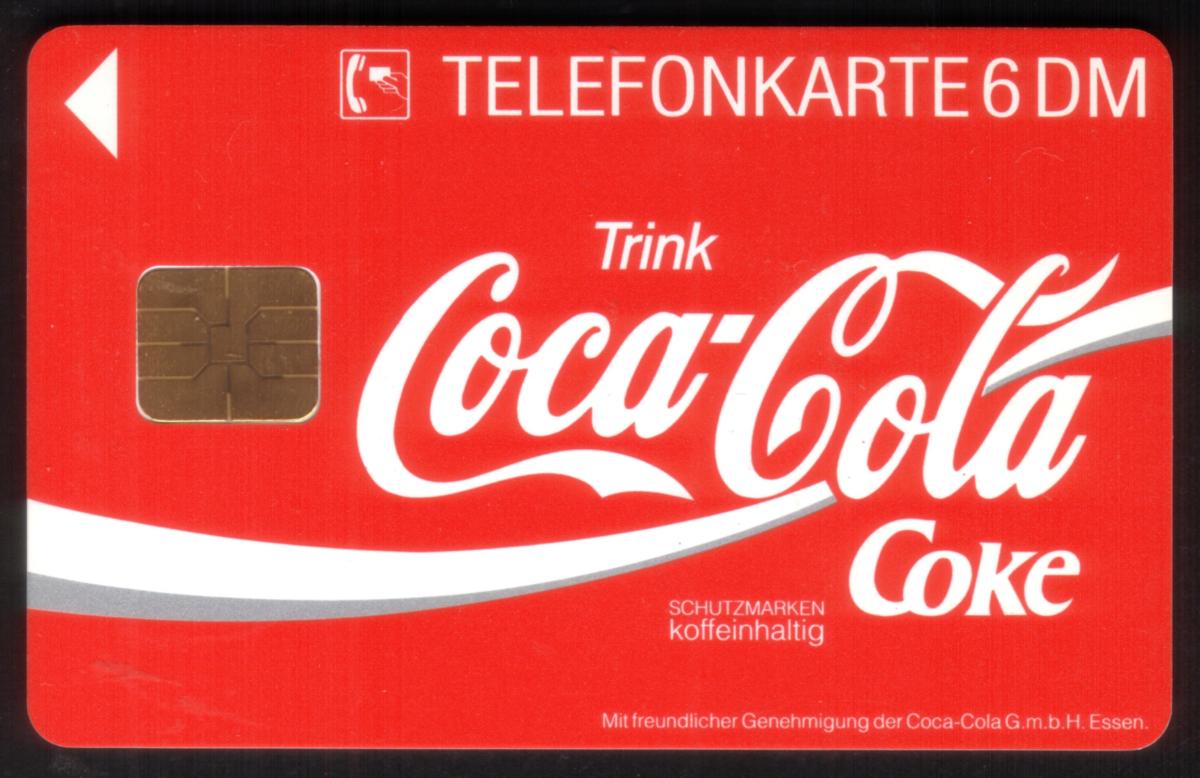 A vintage German chip card from the late 1980s features Coca-Cola branding with a sleek red background and embedded smart chip, blending technology and refreshment. |