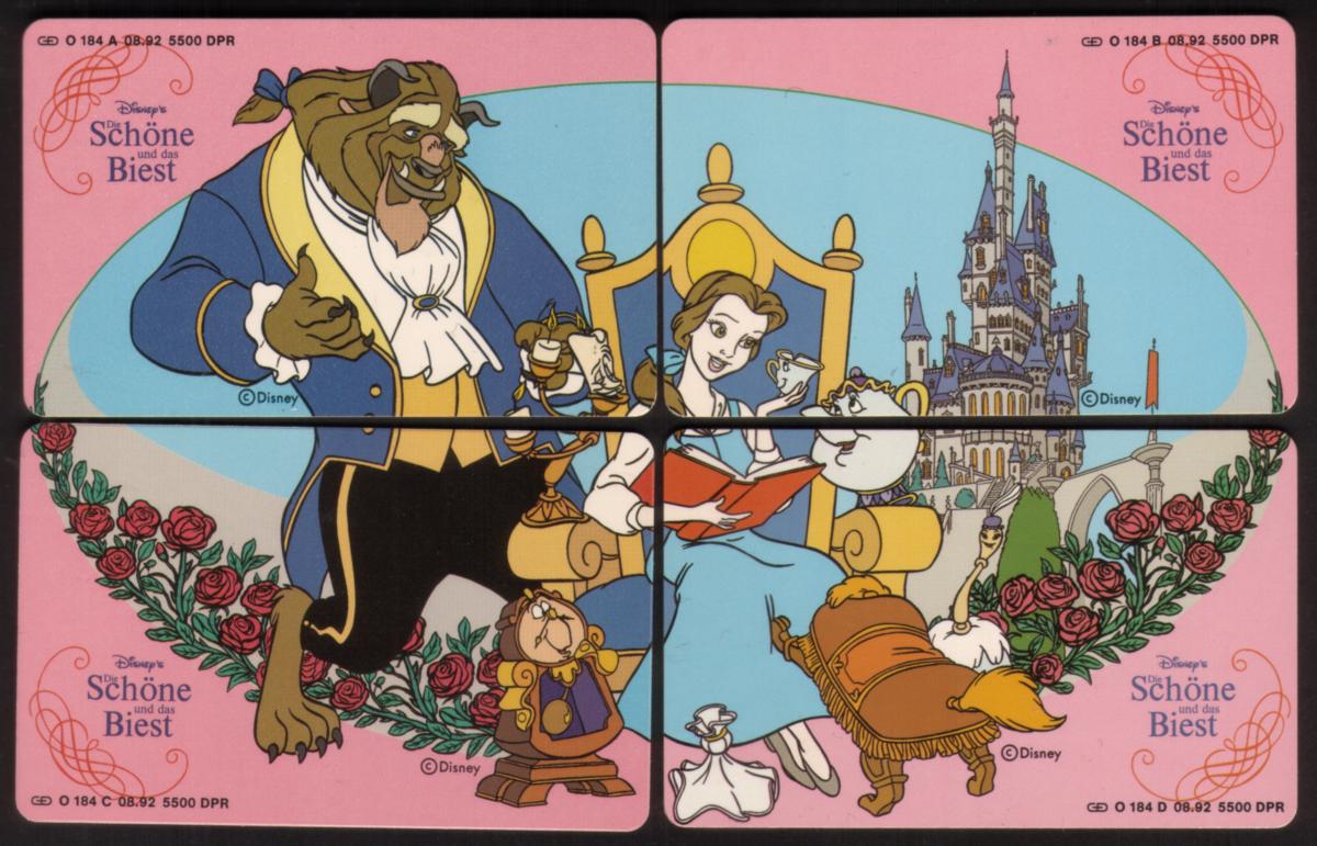 The card presents vibrant colors typical of Disney’s animation style, with clear branding that includes the Disney logo and reference to *Beauty and the Beast (1992)*. The text on the card is printed in English, highlighting the card’s connection to the film and the puzzle concept. The card itself was issued in Germany, as indicated by small text on the front, linking this collectible to the German market.