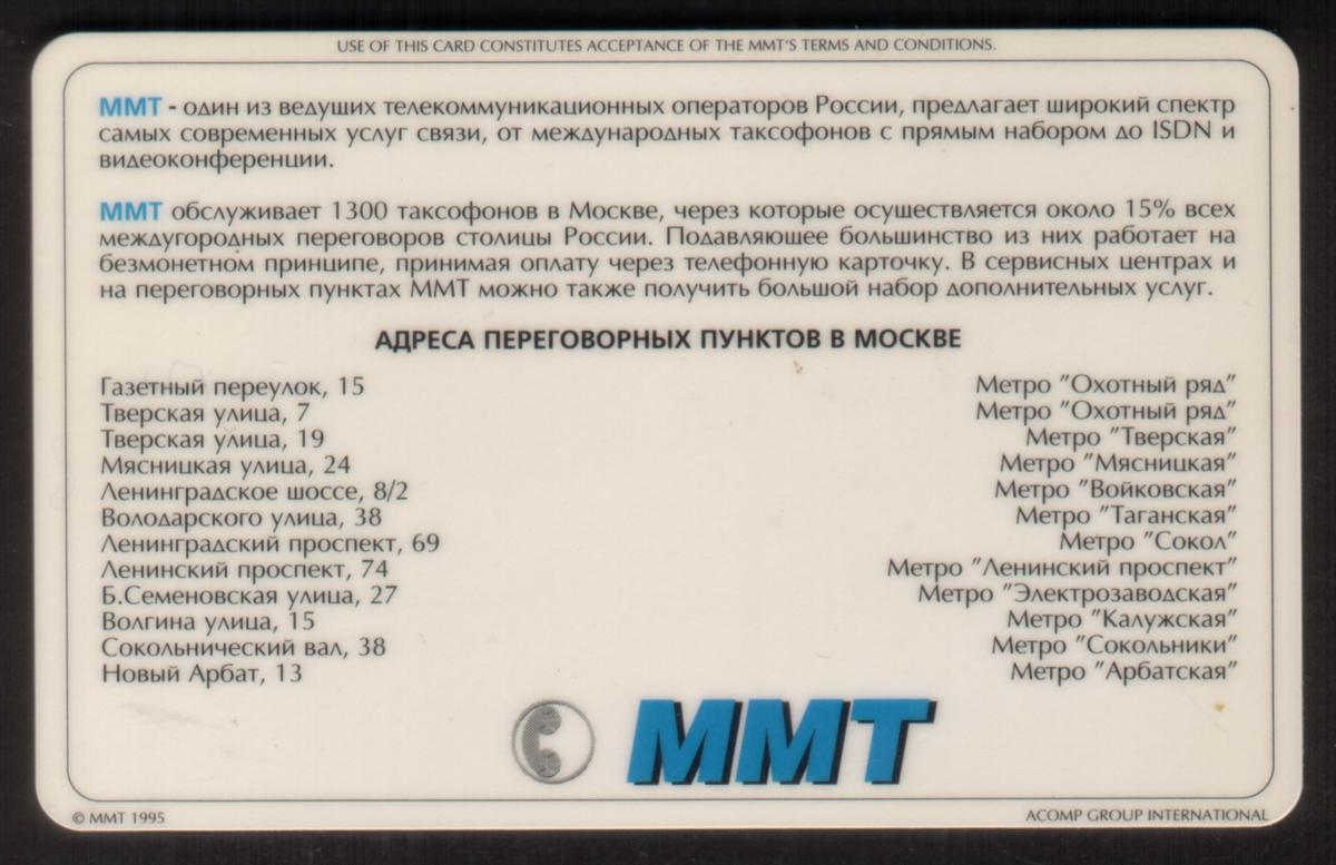 This phone card was issued by Acomp Group International in Russia as part of their MMT series, celebrating traditional communication infrastructure. The visual focus on the classic phone booth door and the clear branding make it a collectible tribute to the history of telephony in Moscow.