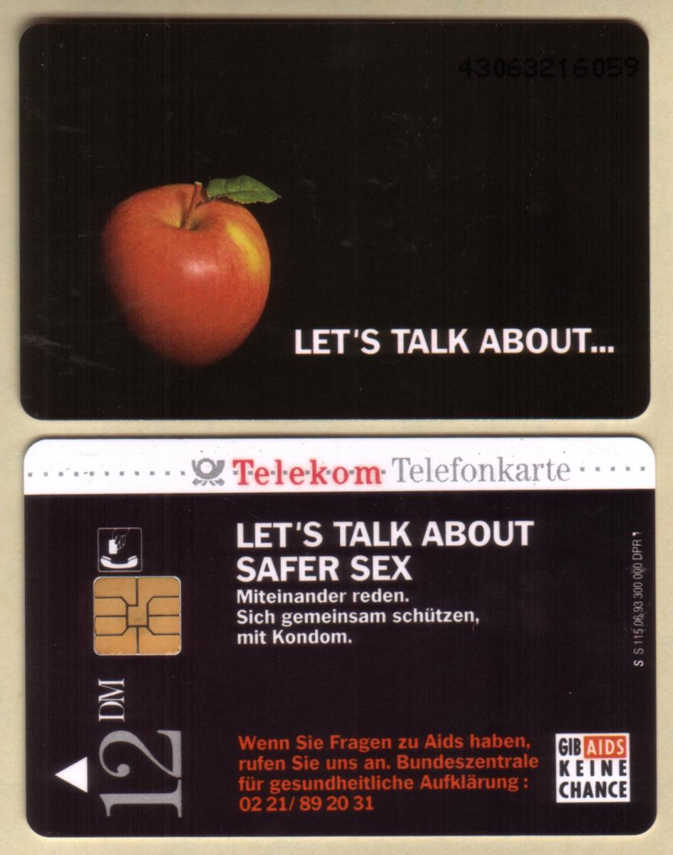 This collectible card features a prominent condom wrapper design from Germany, highlighting the brand "12dm Apple." The card includes a public health message that reads: "Let's Talk About Safer Sex - Don't Give AIDS A Chance." The text is arranged clearly on the front, emphasizing awareness and prevention of AIDS through safer sexual practices.