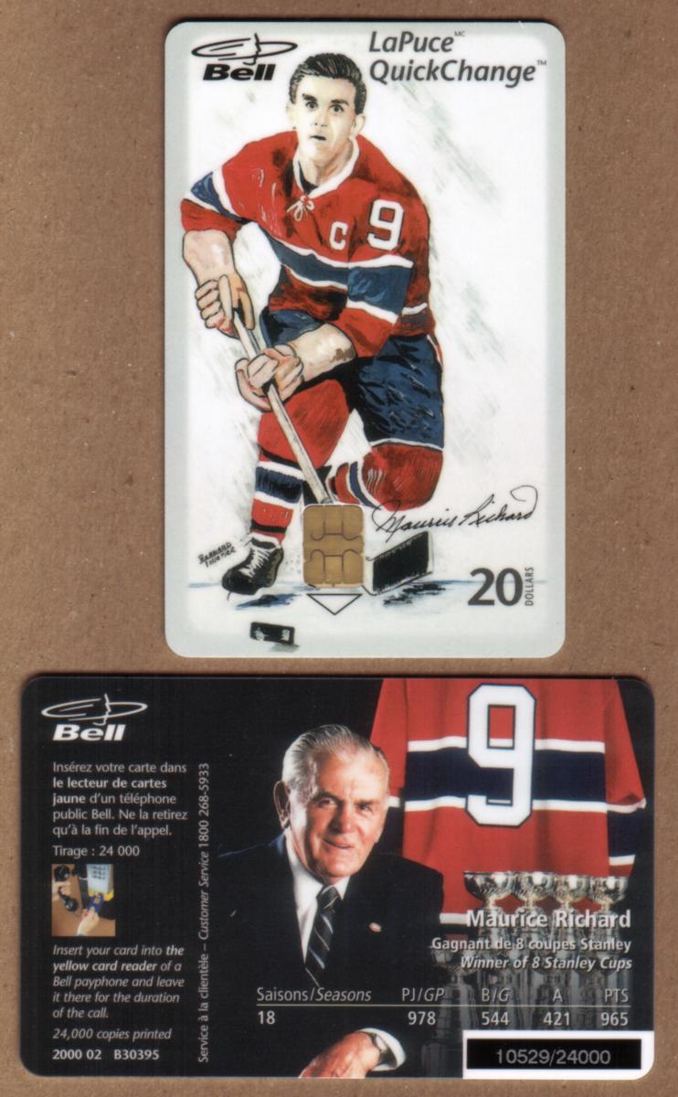 This collectible chip card features Maurice Richard, a legendary Canadian hockey player renowned for winning 8 Stanley Cups. The card displays a sharply detailed image of Maurice Richard in his hockey uniform, prominently associated with his iconic career in the sport. The background incorporates stylized graphics representing hockey themes and the Stanley Cup trophy, emphasizing Richard’s achievement of eight championship victories.