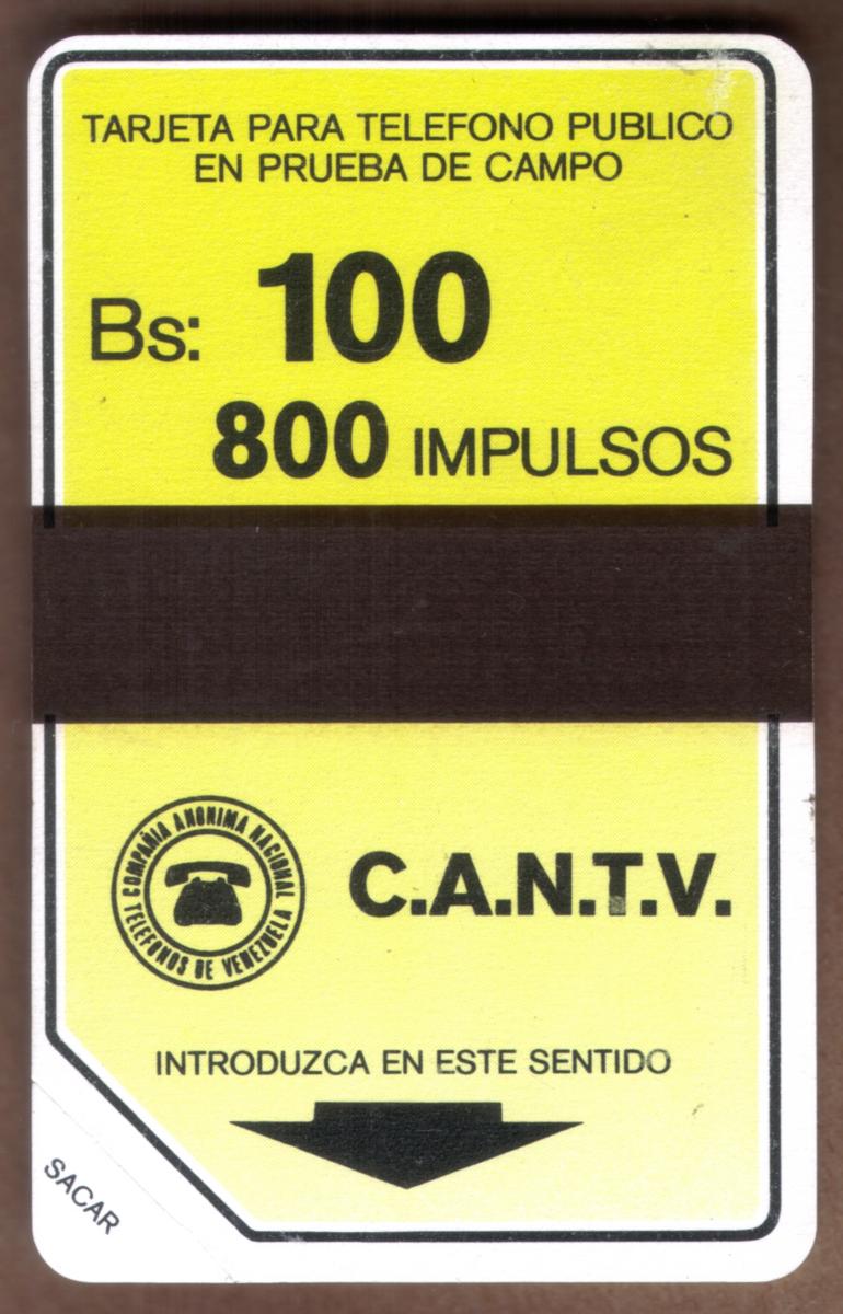 This collectible magnetic stored value phone card is from Venezuela, issued by CANTV (Compañía Anónima Nacional Teléfonos de Venezuela). The card is primarily yellow with black text and features clear information stating it is a public telephone test card ("TARJETA PARA TELEFONO PUBLICO EN PRUEBA DE CAMPO"). It displays a stored value of 100 bolívares (Bs: 100) and provides 800 impulses for telephone use.