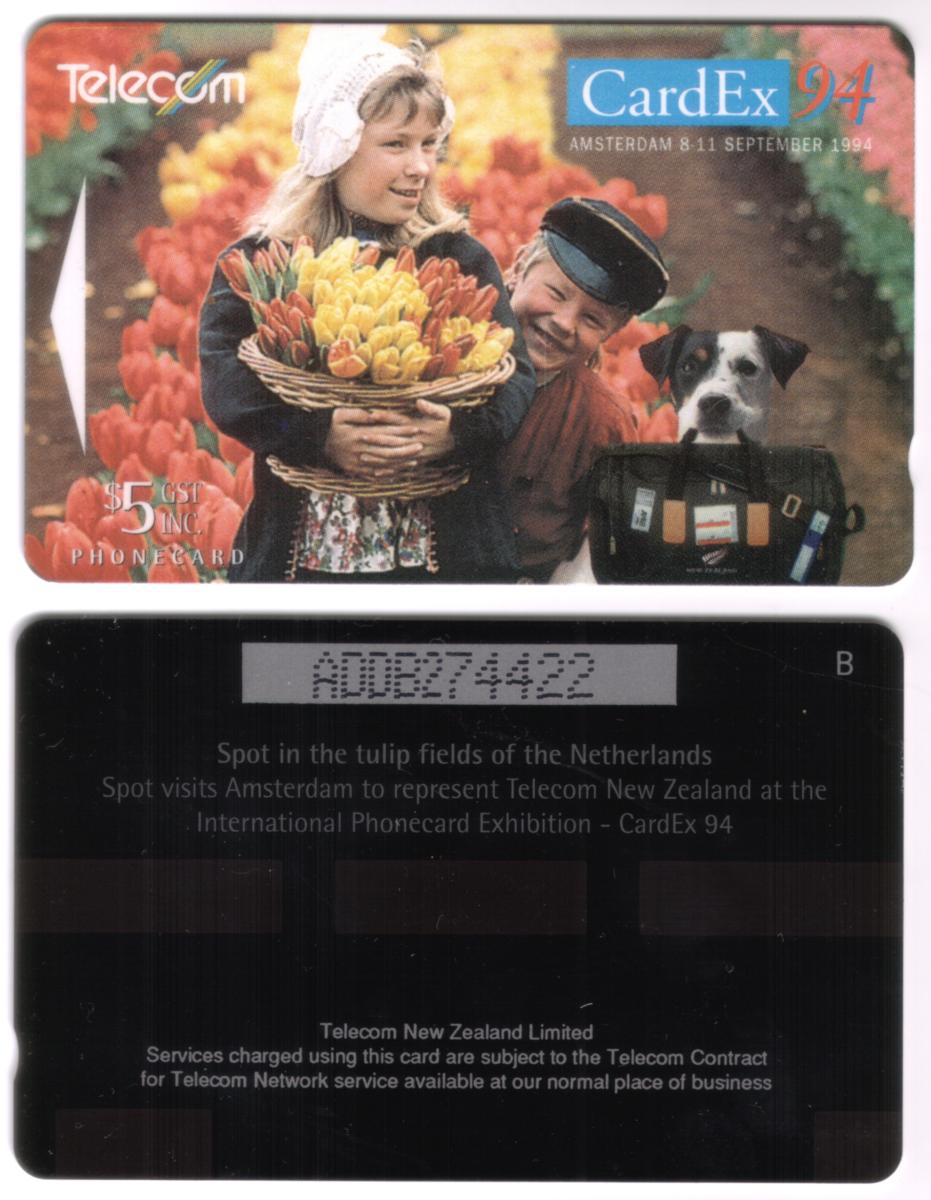 The card is marked with "Cardex 94 Phonecard Expo," indicating it was issued for the 1994 Phonecard Expo event. The word "New Zealand" is prominently displayed in white text over the left image with the dog, while "Spot & Tulips in The Netherlands" is shown in the right half above the tulip photograph. Additional text includes the acronym “l&g” and the phrase "addb" visible near the top portion of the card.