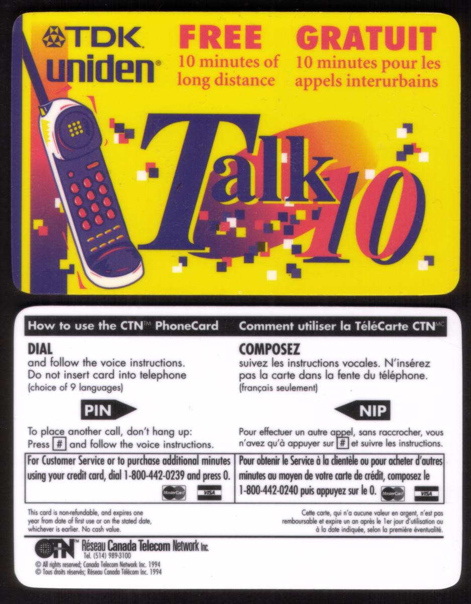 The card includes text that reads “10m Promo TDK Uniden Telephone Portable Phone Talk 1994 SPECIMEN,” indicating its promotional nature and the year connected to its release or theme. The mention of “Canada Telecom Net” ties the card to Canadian telecommunications networks, reflecting the country of origin and service focus. The designation “SPECIMEN” denotes that this card was likely produced for promotional or sample purposes rather than standard commercial distribution.