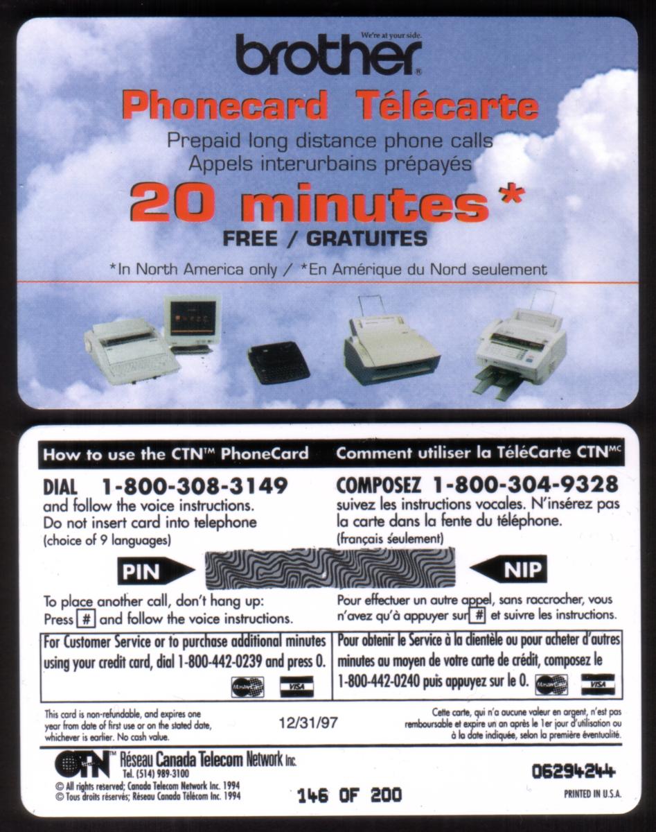 The card is clearly a collectible phone card issued within Canada, meant for use on telephone networks. It features no characters or graphical imagery beyond the text and logos related to Canadian telecommunications and Brother product branding. The card’s style is utilitarian, providing relevant service and expiration details paired with brand identification.