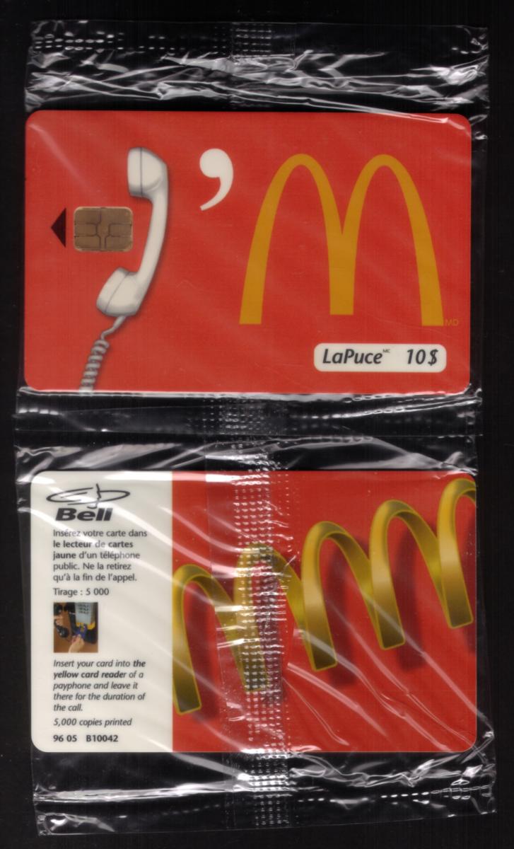 The card carries the designation “B10042” at the bottom, printed in black text on the right side, signifying a specific identifier or serial number for the card itself. Above the Bell logo, the word “Canada” appears in white uppercase text. The card is identified as a stored value phone card, usable for payphone services or telecommunications, issued under Bell Canada. The combination of McDonald’s branding and Bell Canada logos reflects a promotional or co-branded initiative involving these two companies. The card is sealed, preserving its original condition as a collectible item.