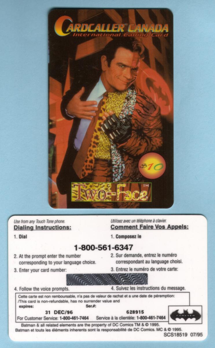 Additionally, “CardCaller” is noted on the card, identifying the company responsible for its issuance or distribution. The card is part of a collectible series connected to *Batman Forever* and its characters, making it a specific memorabilia item for fans of the movie and the DC Comics franchise. The location "Toronto Canada" is printed, providing geographic context related to the card’s release or availability.
