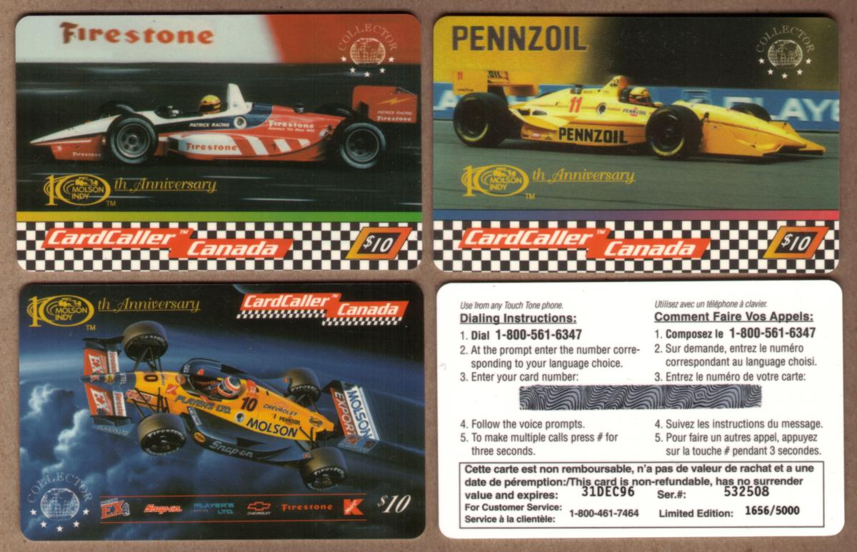 The card’s denomination is $10, and it is part of a set of three cards released to mark this special anniversary. The card’s text includes “Molson Indy 10th Anniversary Firestone Pennzoil Kmart Set of 3 – Canada,” clearly connecting it to the Canadian auto racing scene and the official celebration of a decade of the Molson Indy races. The imagery and text together highlight the significance of Chevrolet and major sponsors in the sport.