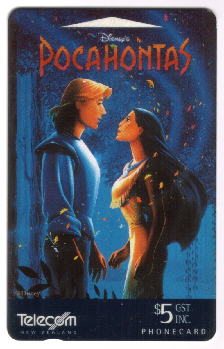 The card originates from New Zealand and is categorized as a used collectible. It showcases the two main characters together, emphasizing the relationship central to the storyline of the film. The background and additional visual elements complement the main image of Pocahontas and John Smith, highlighting the card’s theme based on Disney’s Pocahontas.