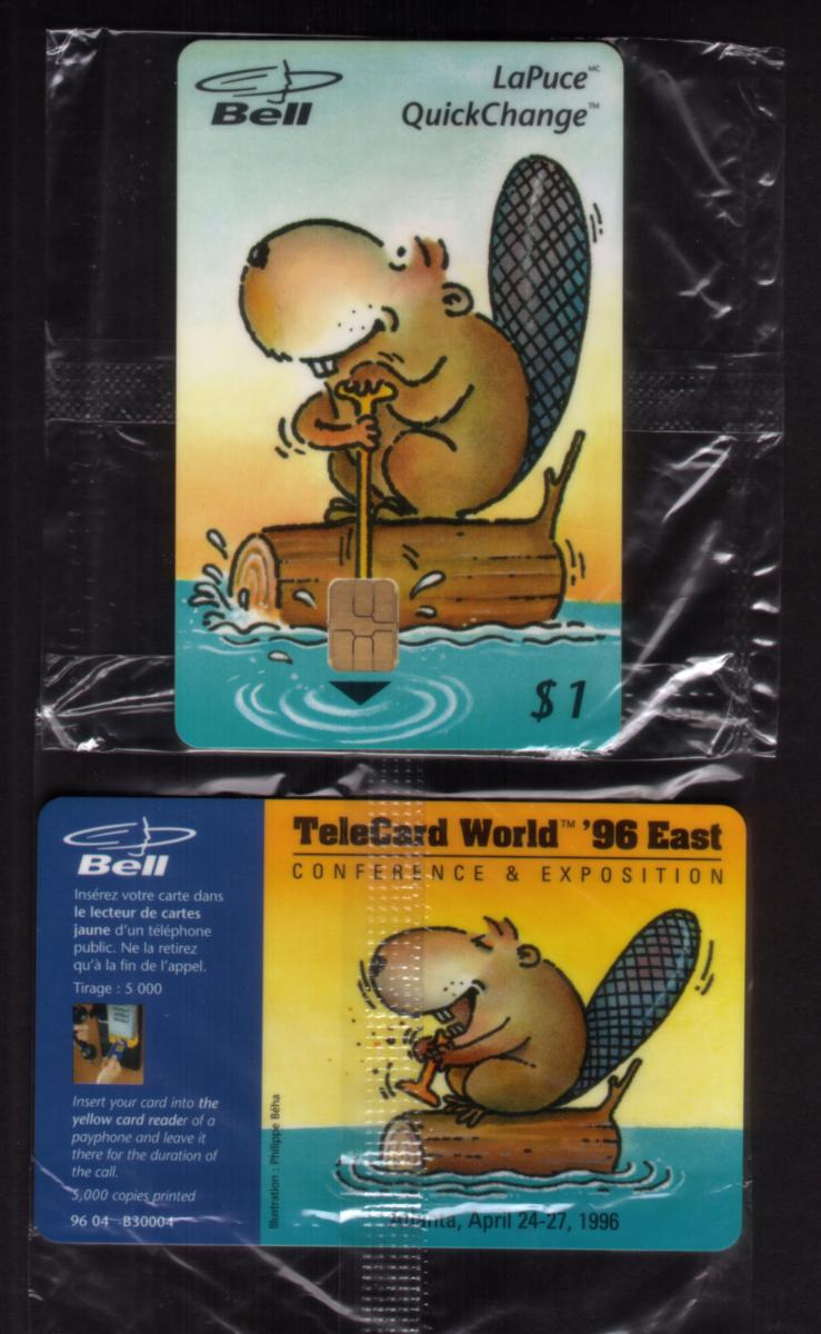 This collectible chip card is a sealed $1 TeleCard produced by LaPuce in Quebec, Canada. It is titled B30004 World '96 East Show Card and features an image of a beaver paddling a log in a natural setting with water visible. The card is associated with the 1996 conference and exhibition held in Atlanta, Georgia, specifically related to WorldCom and smart stored value cards (SVC). The front shows the Canadian maple leaf symbol indicating its origin and contains smart card chip technology.