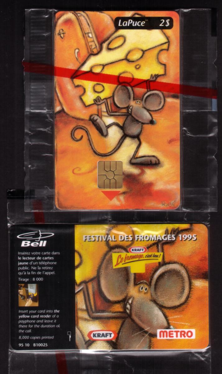 Overall, this collectible is a sealed promotional smart card issued in Canada, associated with Bell: LaPuce, highlighting the 1995 Cheese Festival with a distinctive cartoon mouse and Kraft cheese artwork.