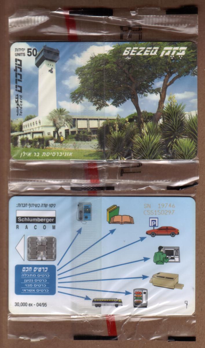 This collectible chip card from Israel is a stored value smart card featuring a detailed design marking the first Schlumberger Issue from November 1994. The card has a multipurpose function and is manufactured with a 50-micron thickness. The front surface showcases the chip and printed information relevant to the card's service as a stored value card (SVC). It is sealed, indicating it is unused and preserved in its original condition.