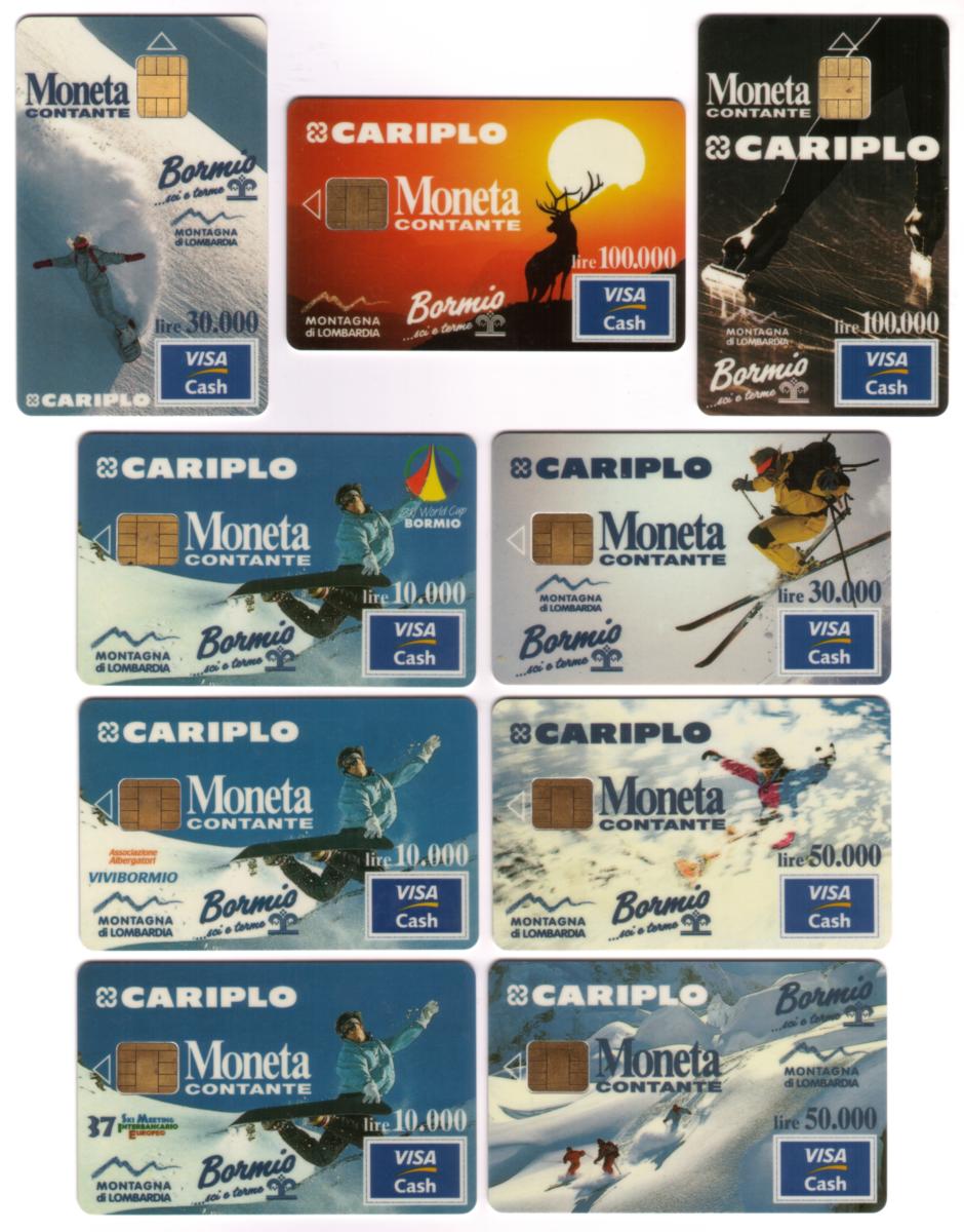 This collectible card features a detailed image related to snow skiing set in Italy, specifically referencing Bormio, a town in the mountainous region of Lombardia. The card is identified as a stored value card used for financial transactions and bank services, prominently marked as a Visa Cash Card. It includes the term "Moneta Contante," which translates to "cash money," emphasizing its function as a cash-in card.
