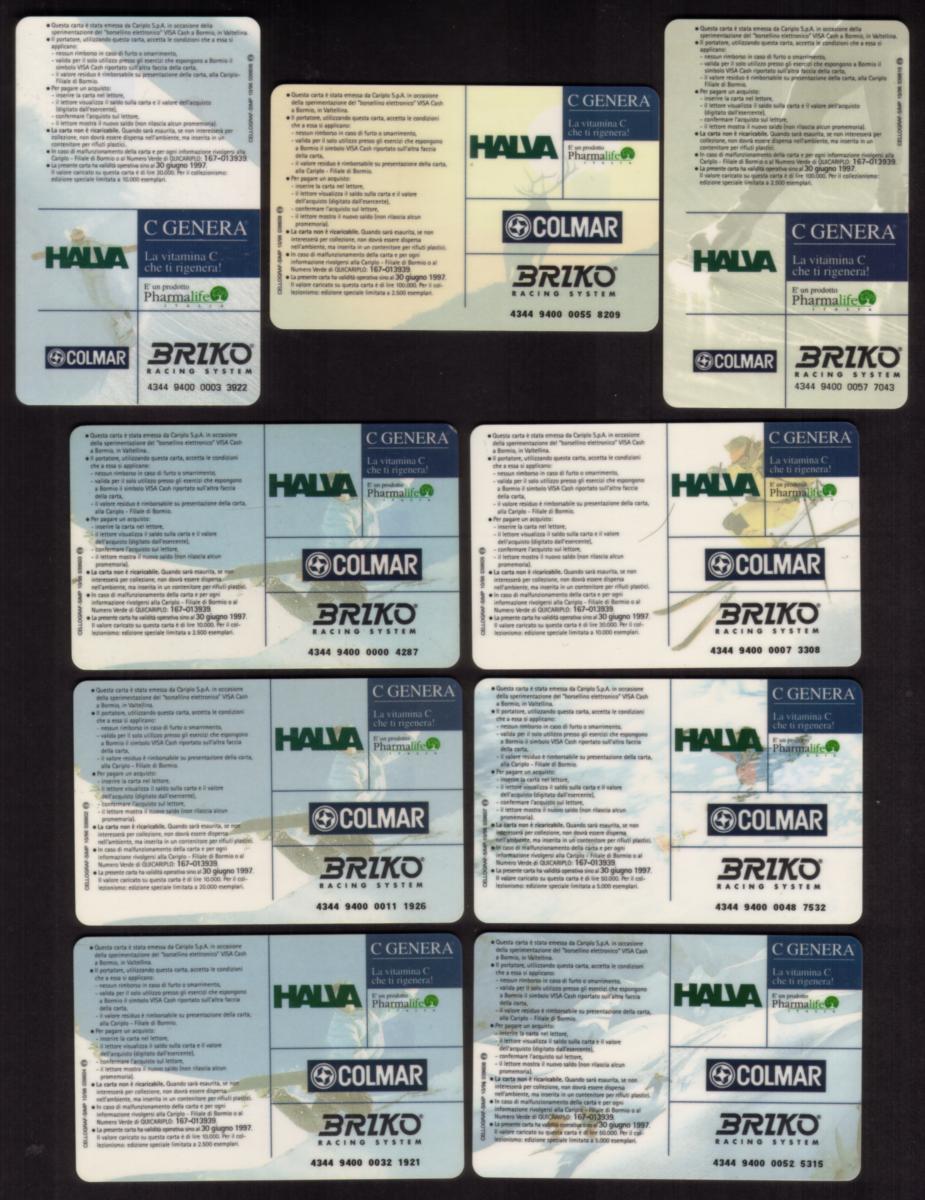 This card is part of a set titled Visa Cash Inaugural Set of 9, and it is used, confirming its status as a collectible item. The card's appearance clearly connects to winter sports, financial services, and the location of Bormio in northern Italy's mountains, merging regional, banking, and skiing themes for collectors and users.