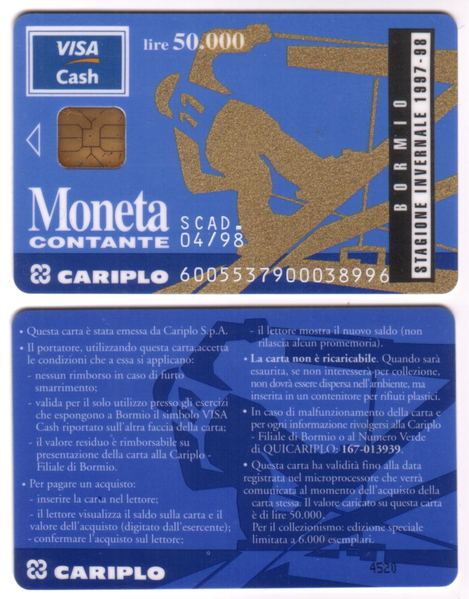 Overall, this neat collectible highlights winter sports through the image of a skier at Bormio, Italy, paired with practical use as a Visa Cash stored value card issued by Cariplo for the 1997-1998 winter season.