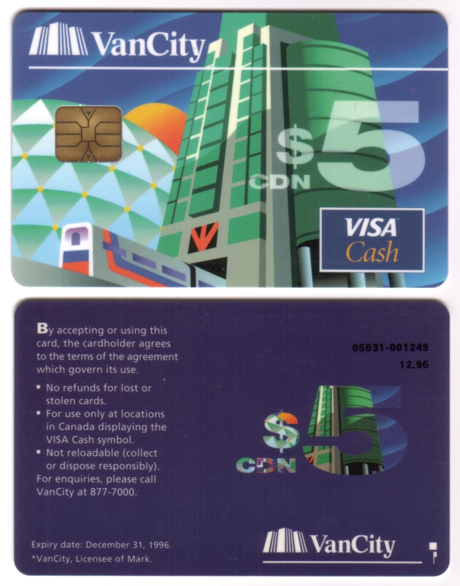 Overall, this Visa Cash stored value card represents a trial or promotional version associated with VanCity and Science World in Vancouver, Canada. The card merges branding elements from VanCity with scientific imagery, emphasizing its connection to local science education and financial services.