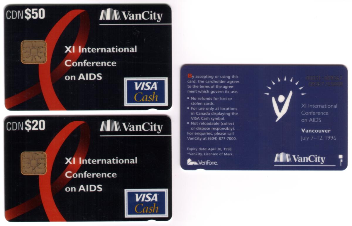 Additional branding includes the Verifone logo positioned near the bottom right corner, representing the payment processing technology used for transactions. The card number and Visa Cash service mentions appear clearly on the front. It also displays “svc” along with “smart card” wording, emphasizing the electronic chip-based technology integrated in the card. The overall design balances corporate logos with clear text, reflecting a financial payment card issued for practical use and collectible purposes tied to VanCity and the AIDS Conference event.