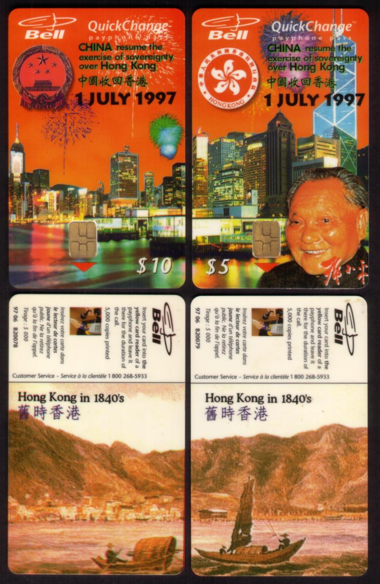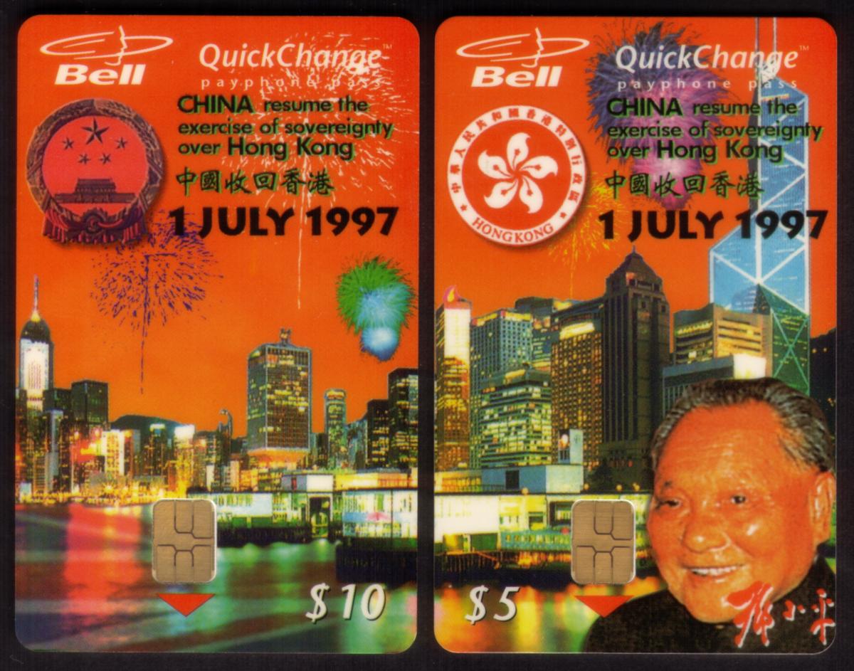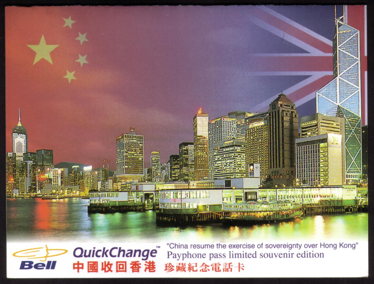 The card is marked with "Hong Kong Return To China July 1997" and "Canada Bell QuickChange" indicating its association with a special issue related to that historic event. The text on the card also includes "svc $15," designating it as a stored value card. Additional identifiers on the card include references to B20078 and B20079.