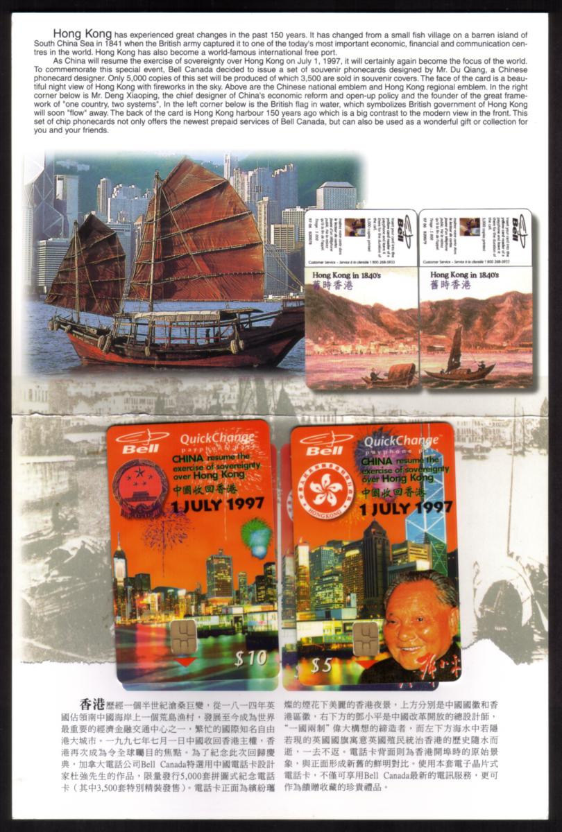 This card belongs to a two-card puzzle set contained within a folder, linked to the commemorative theme of Hong Kong’s return to China. It is a smart card designed for telecommunications use, identifiable as a chip card with integrated circuitry visible on its surface.