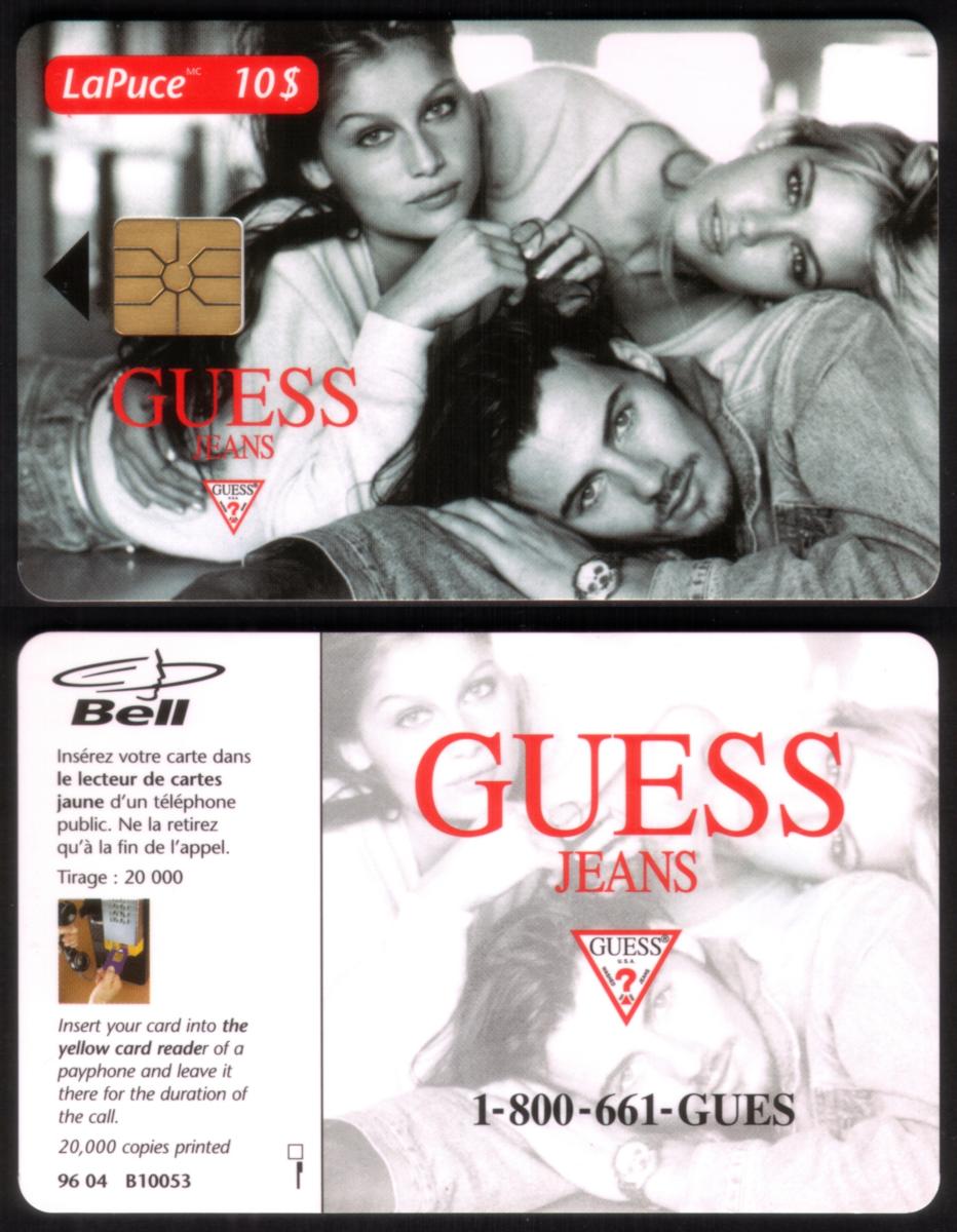 This collectible smart card from Canada features branding associated with Guess Jeans. The card prominently displays the Guess Jeans logo in a large, stylized font. It is a stored value card with a value of $10, as indicated by the numeric value "$10" printed on the front. Positioned on the lower left side is the logo for Bell LaPuce, a Canadian telecommunications company, signifying the card’s use as a smart chip service card.