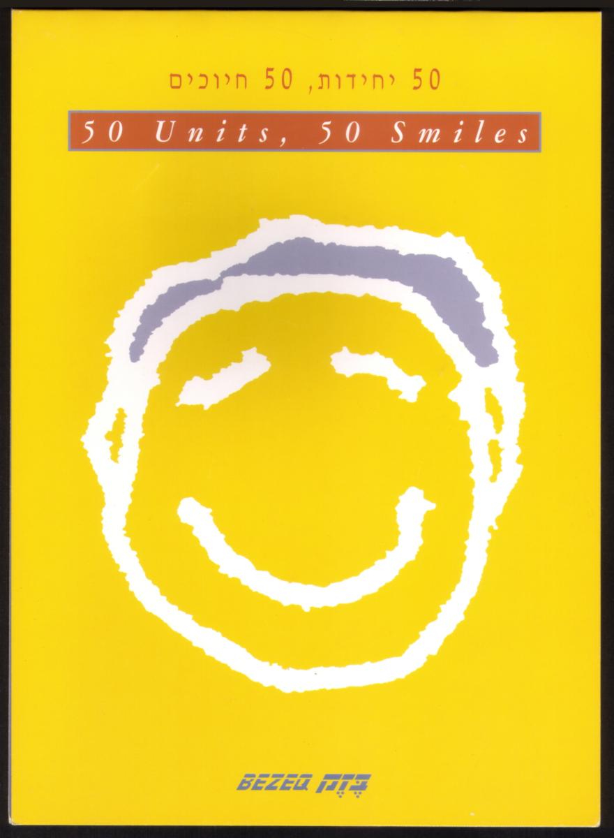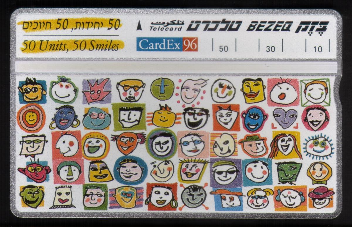The card includes information about its value units, showing "50" prominently beside smaller numbers 30 and 10, which refer to its usage units. The phrase "Telecard Bezeq" appears at the top right corner in Hebrew and English, identifying the card as part of the Israeli phone system provider Bezeq. The combination of the CardEx 96 logo and the theme of “50 Smiles” reflects the celebration of the 1996 CardEx exhibition.